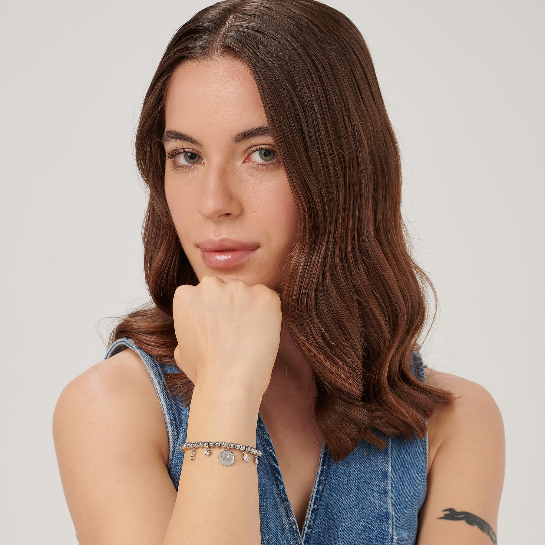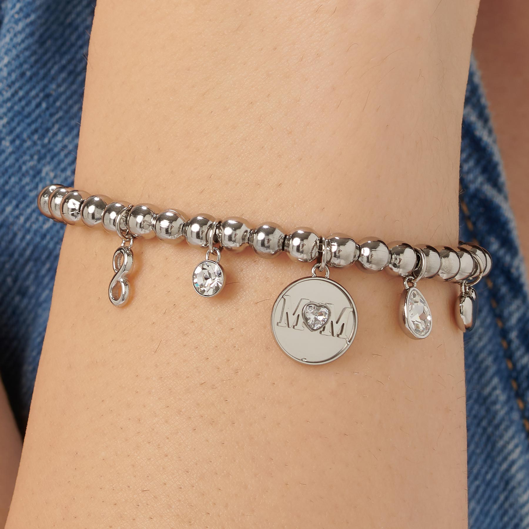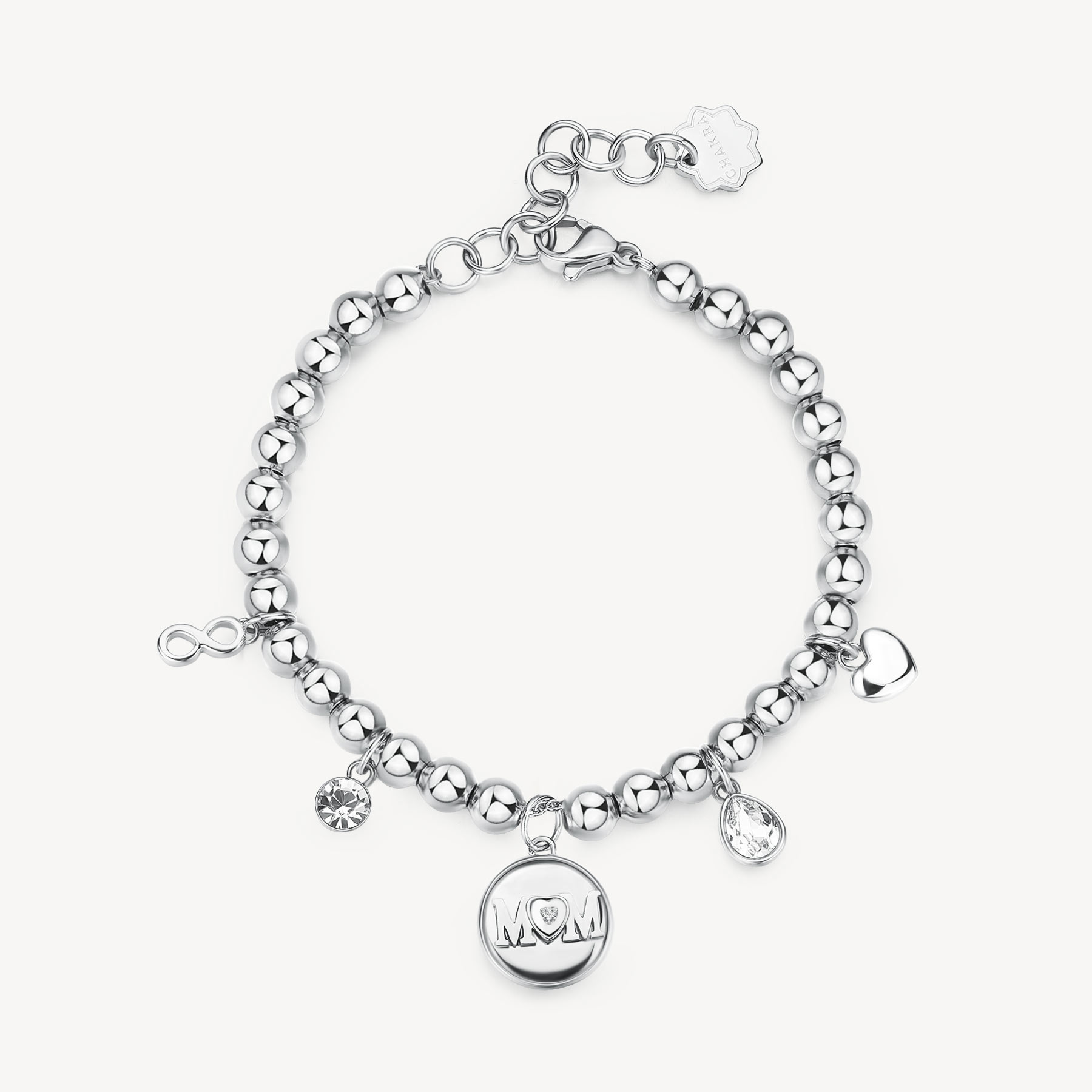 Armband mit 316L Edelstahlbeads und zentralem Charm mit der Aufschrift "mom", Herz-charm, Unendlichkeit und Kristallen.