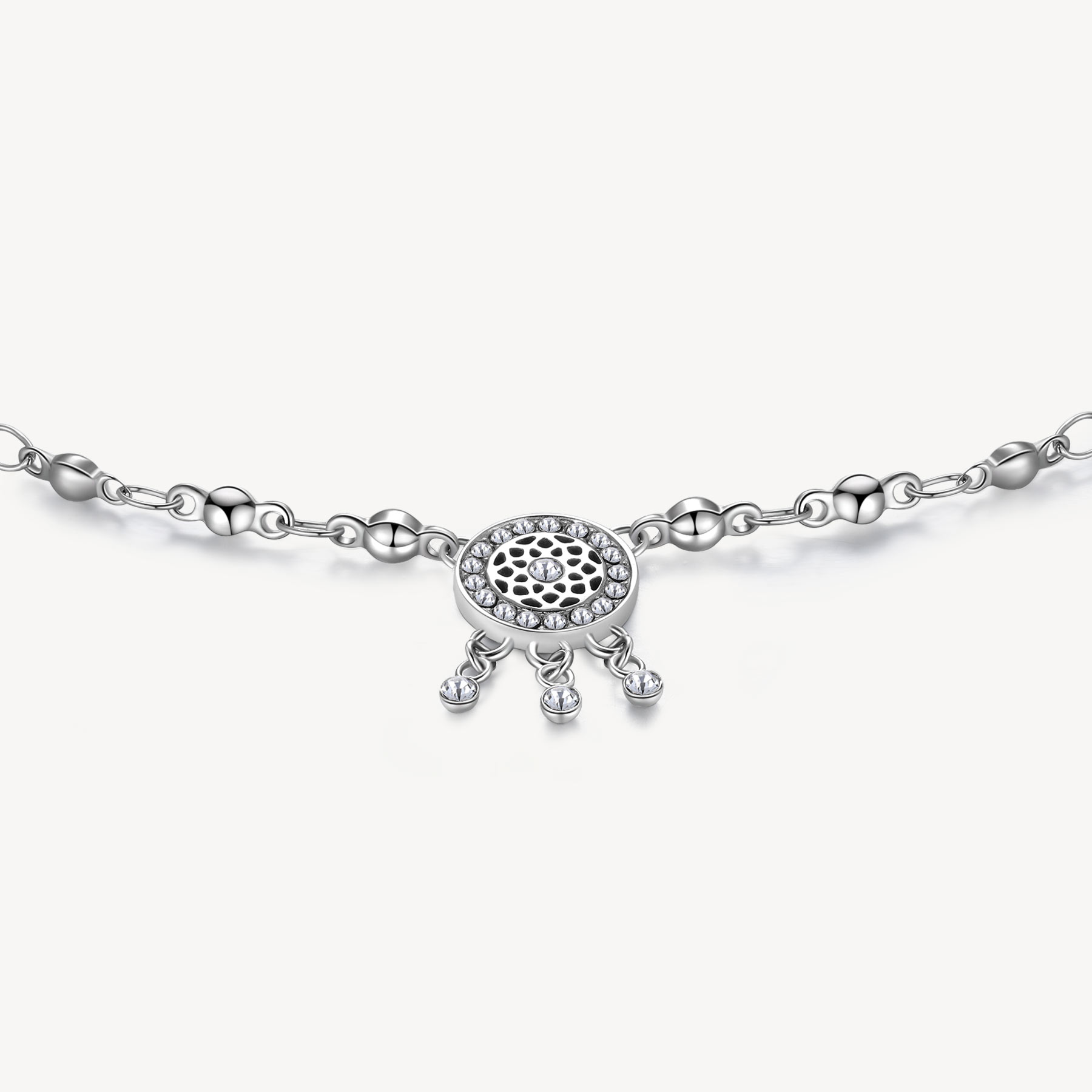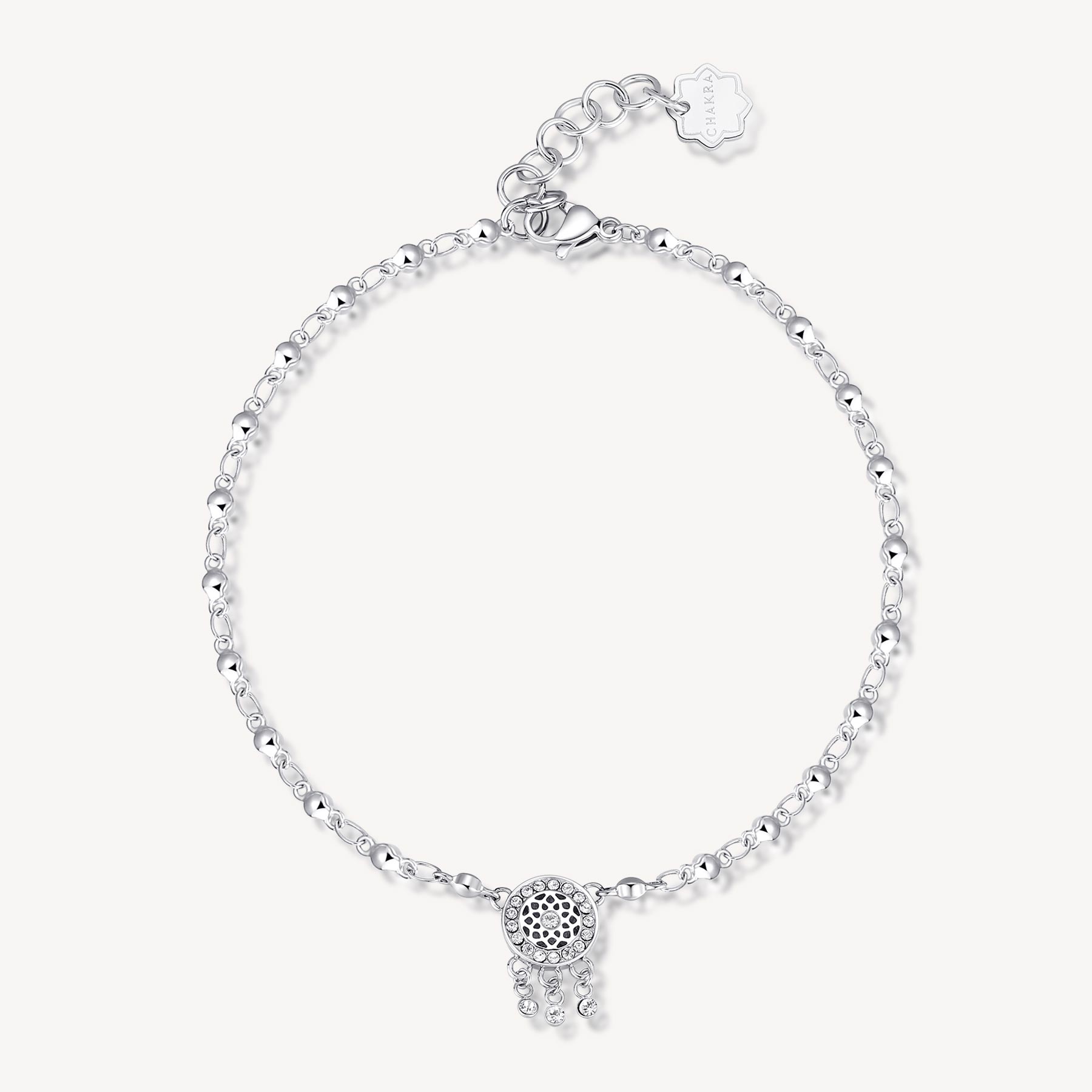 Fußkettchen aus 316L-Edelstahl mit Anhänger in Form eines Traumfängers und Kristallen.