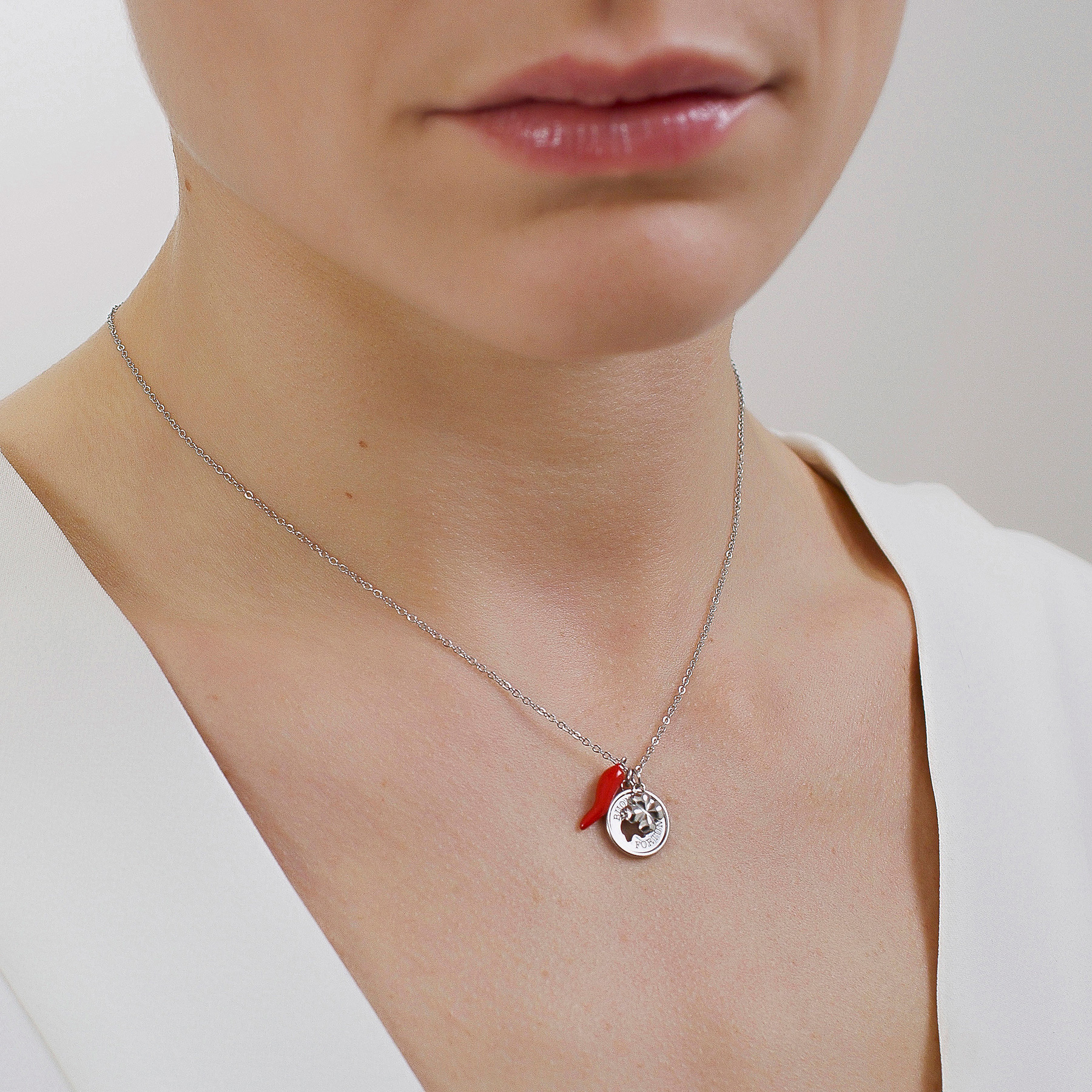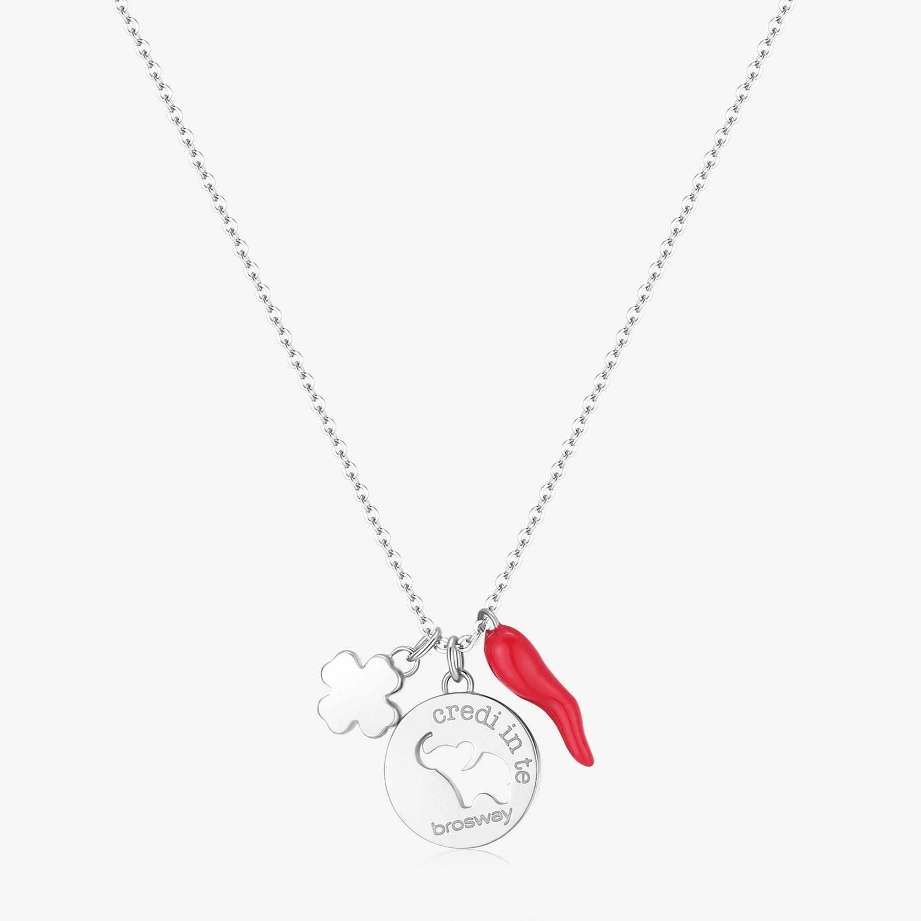 Halskette aus 316L-Edelstahl mit Elefant und Gravur "Buona Fortuna", Anhänger in Form eines vierblättrigen Klees und Anhänger in Form eines Horns mit roter Emaille.