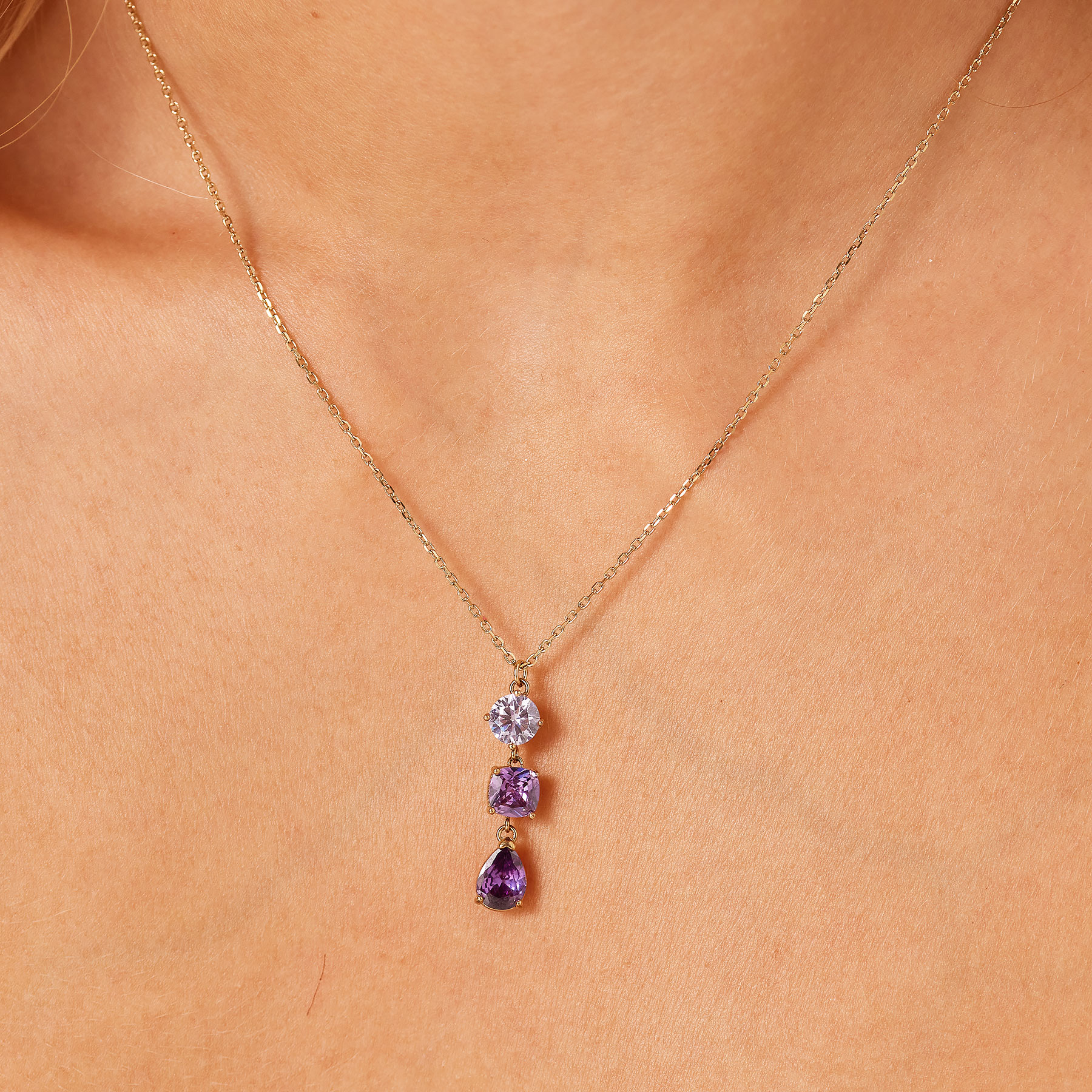 Halskette aus 316L Edelstahl mit 14K-vergoldeter-PVD-Beschichtung und Anhänger mit round, cushion und pear kubischen Zirkonia in der Farbe amethyst.