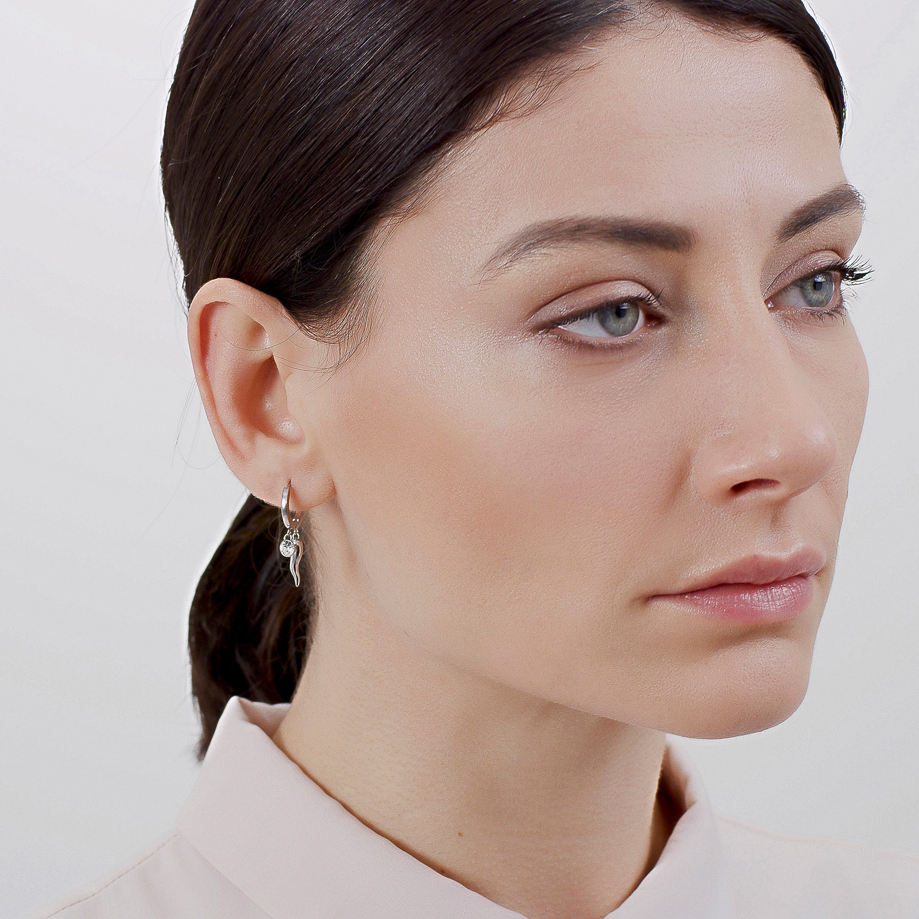 Einzelner Ohrring aus 316L Edelstahl mit Glückshorn und klarem Kristall.