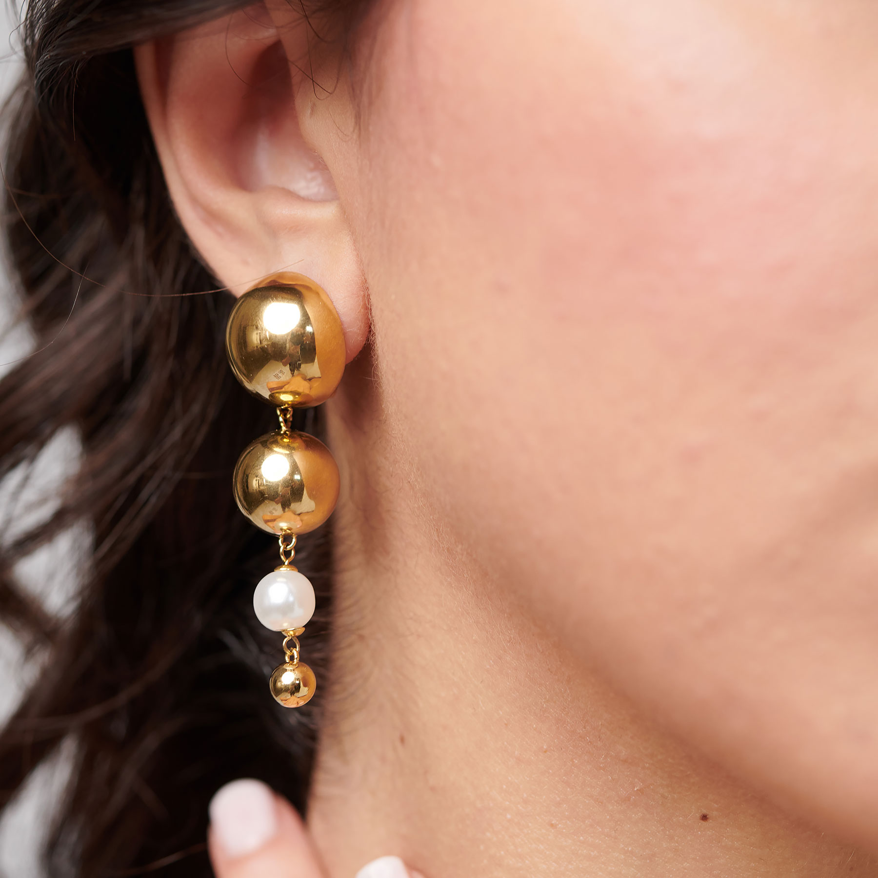 Hängende Ohrringe aus 316L Edelstahl mit 14K-vergoldeter-PVD-Beschichtung mit Kugeln und Muschelperlen.