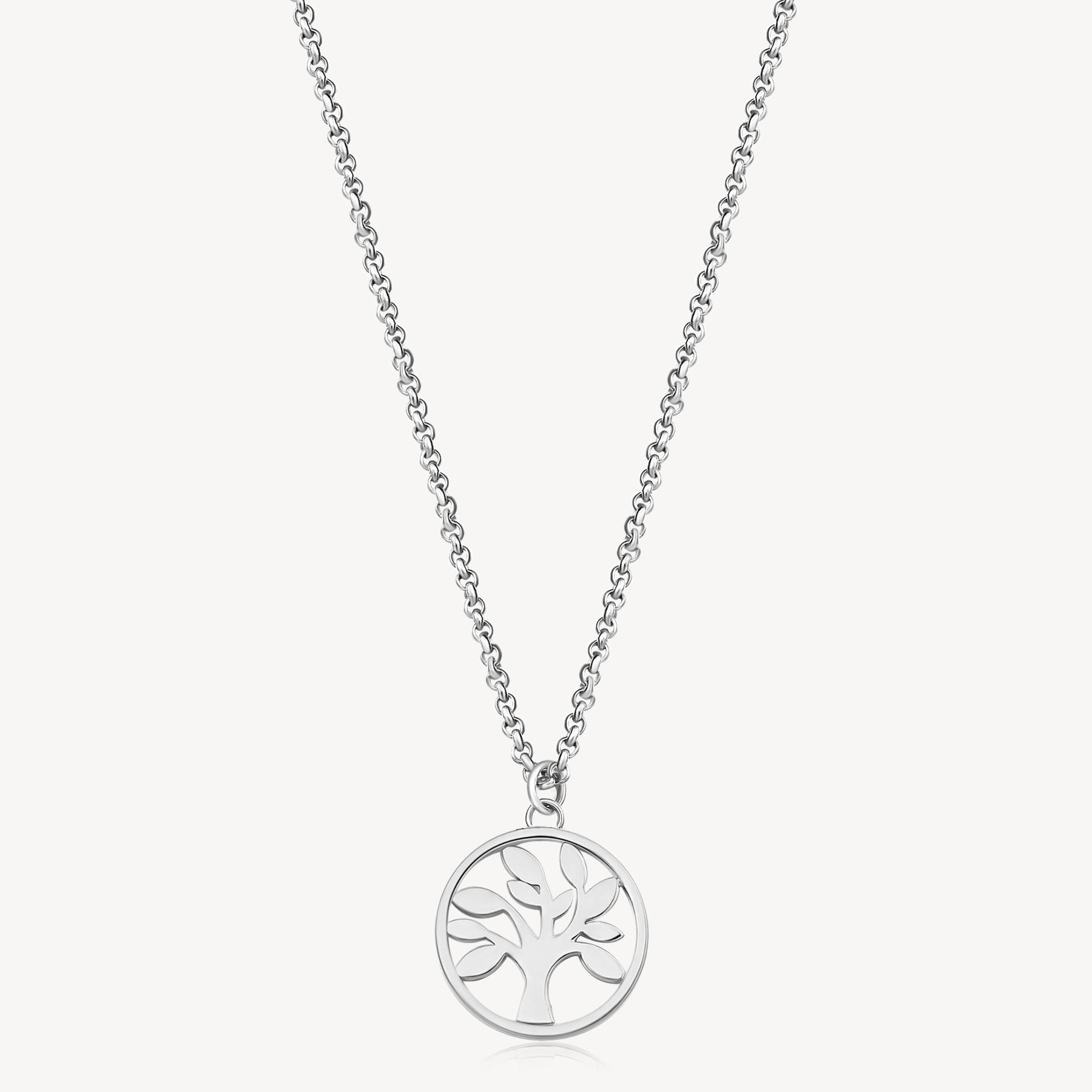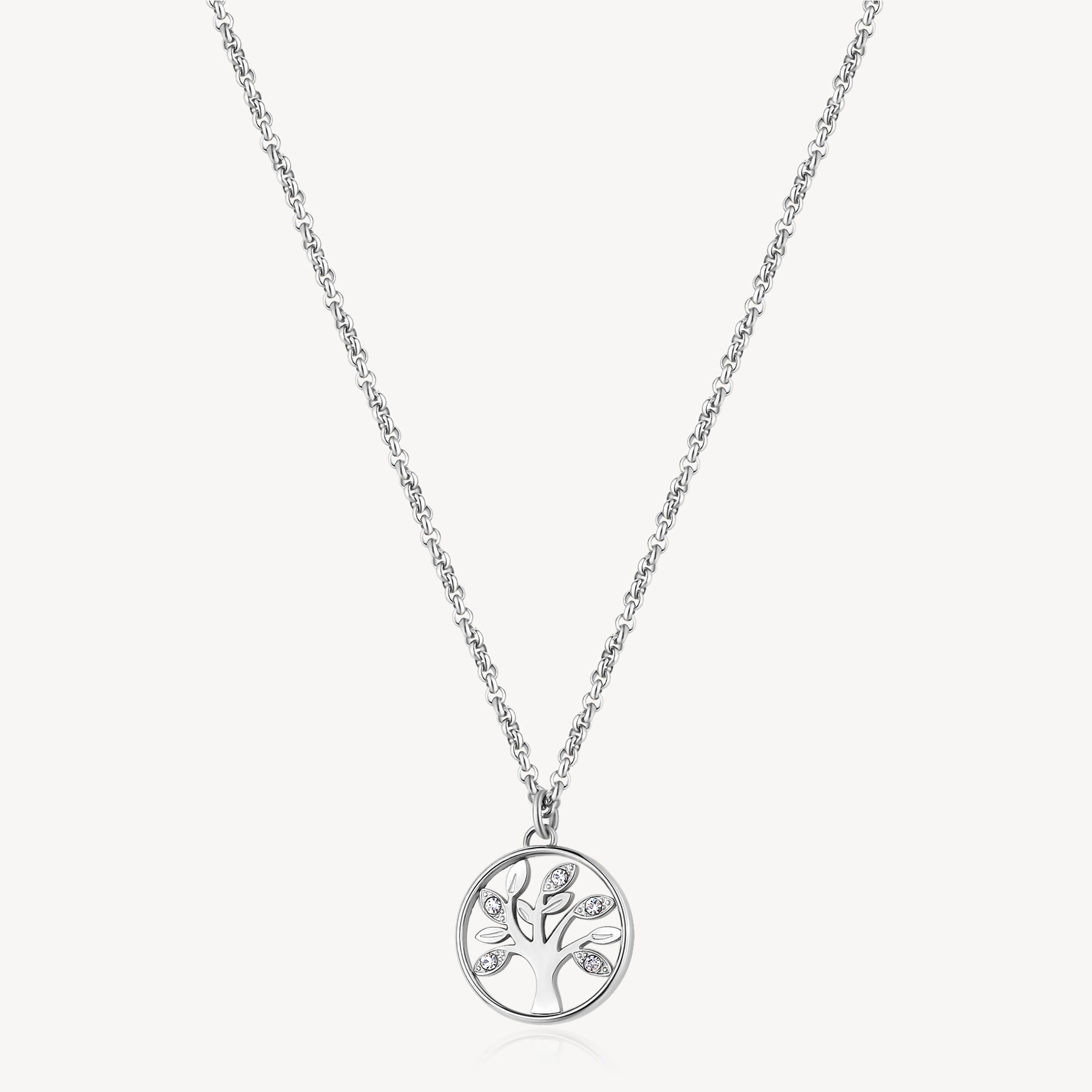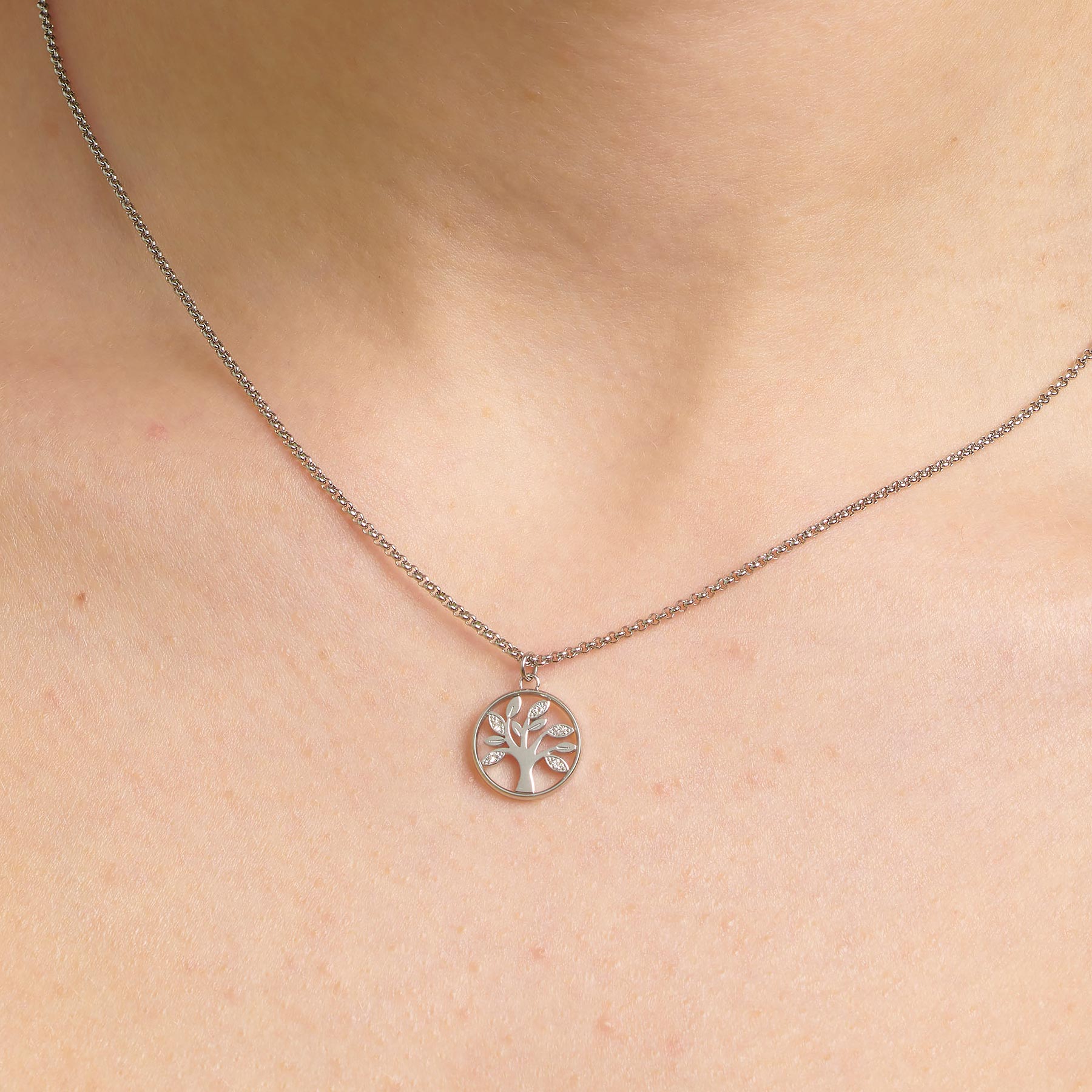 316L stainless steel necklace with tree of life shaped pendant and clear crystals.