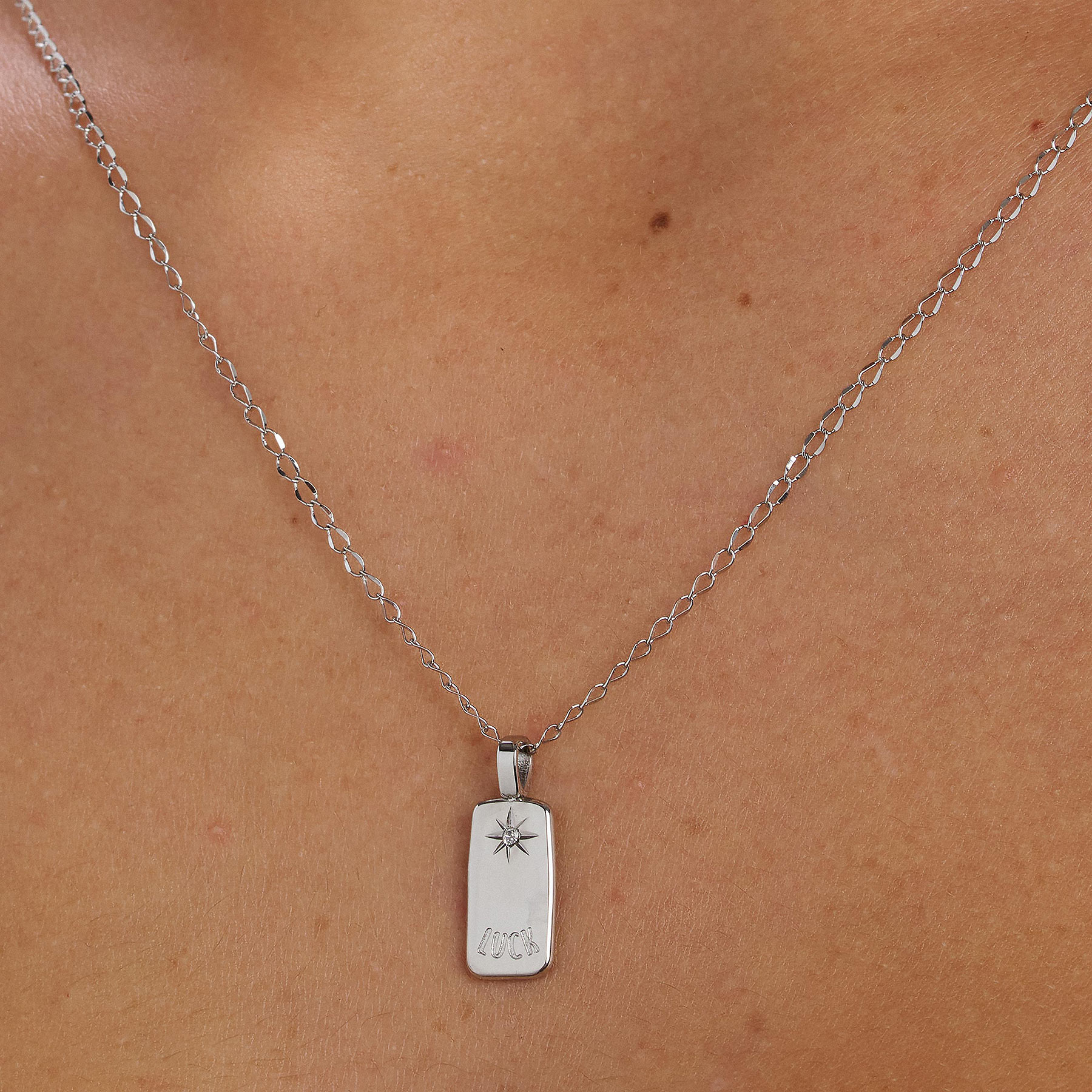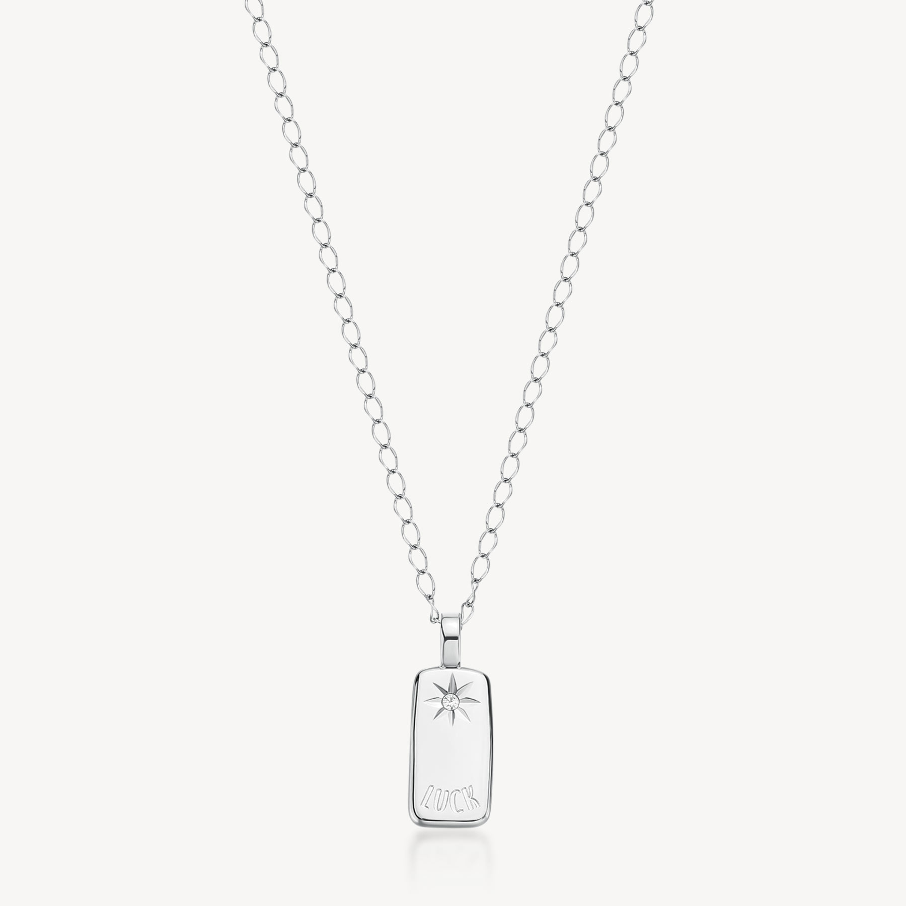 316L stainless steel long necklace and pendant engraved with "LUCK" and clear crystal.