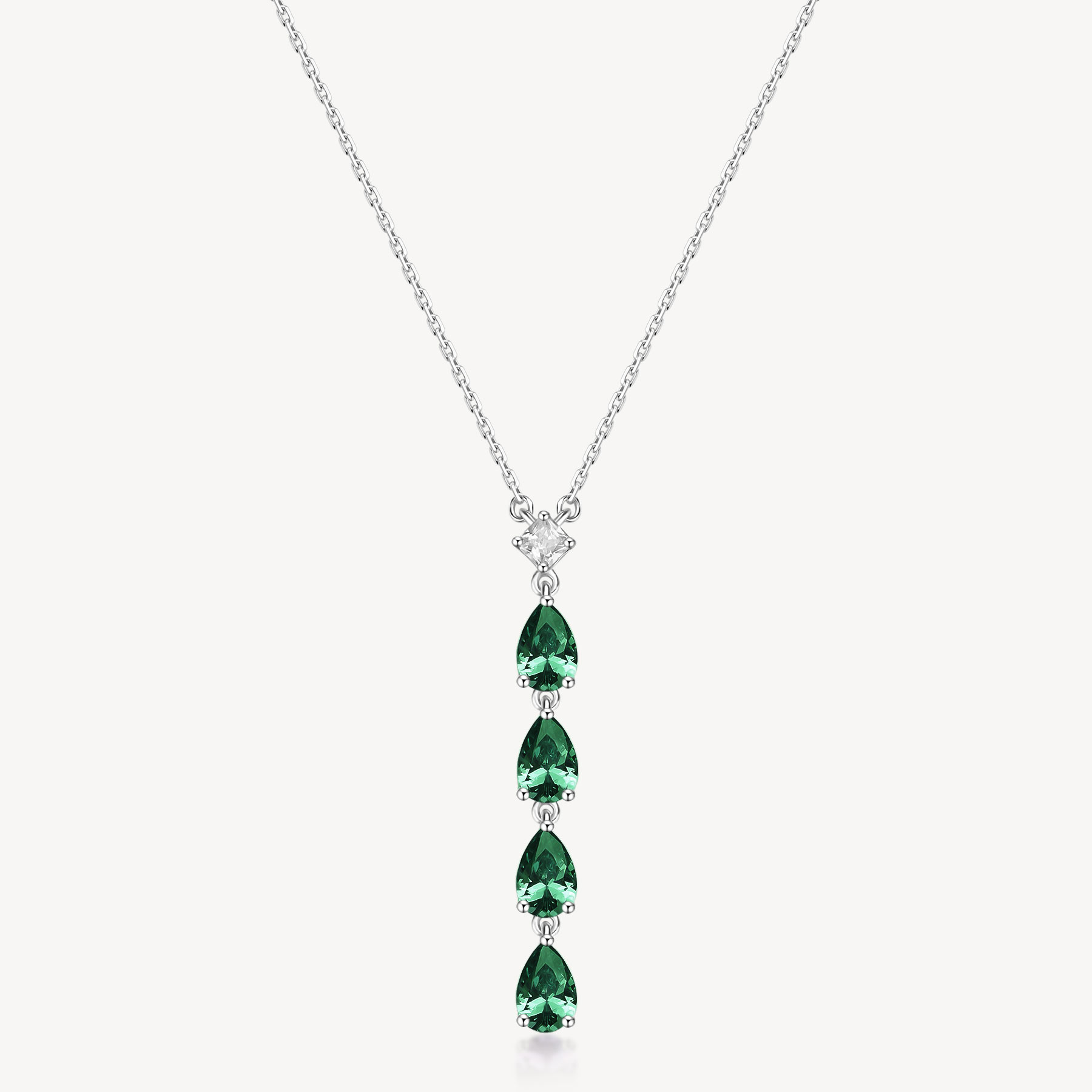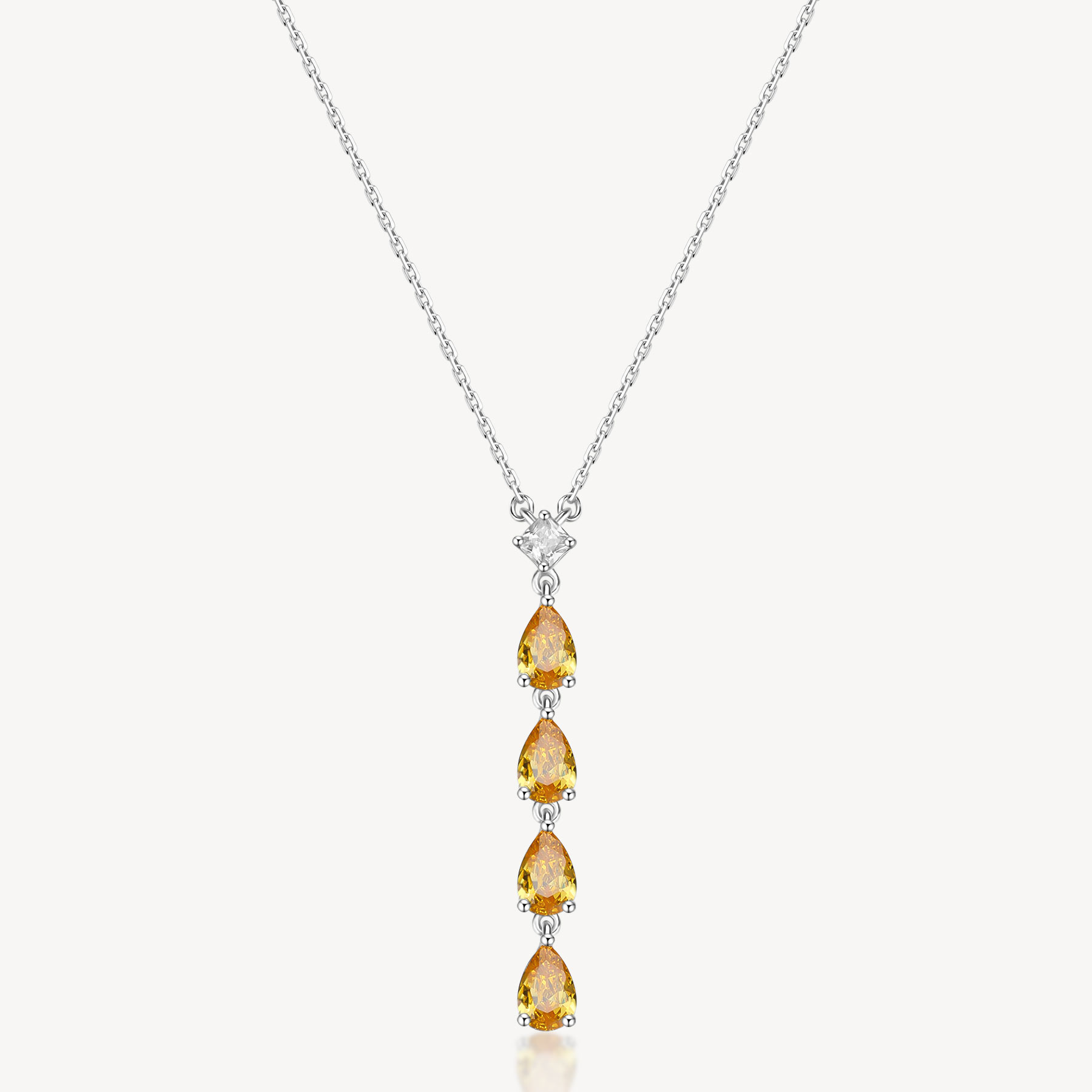 925‰ rhodium-plated sterling silver necklace and pendant with clear square cubic zirconia and sapphire color pear cubic zirconia.