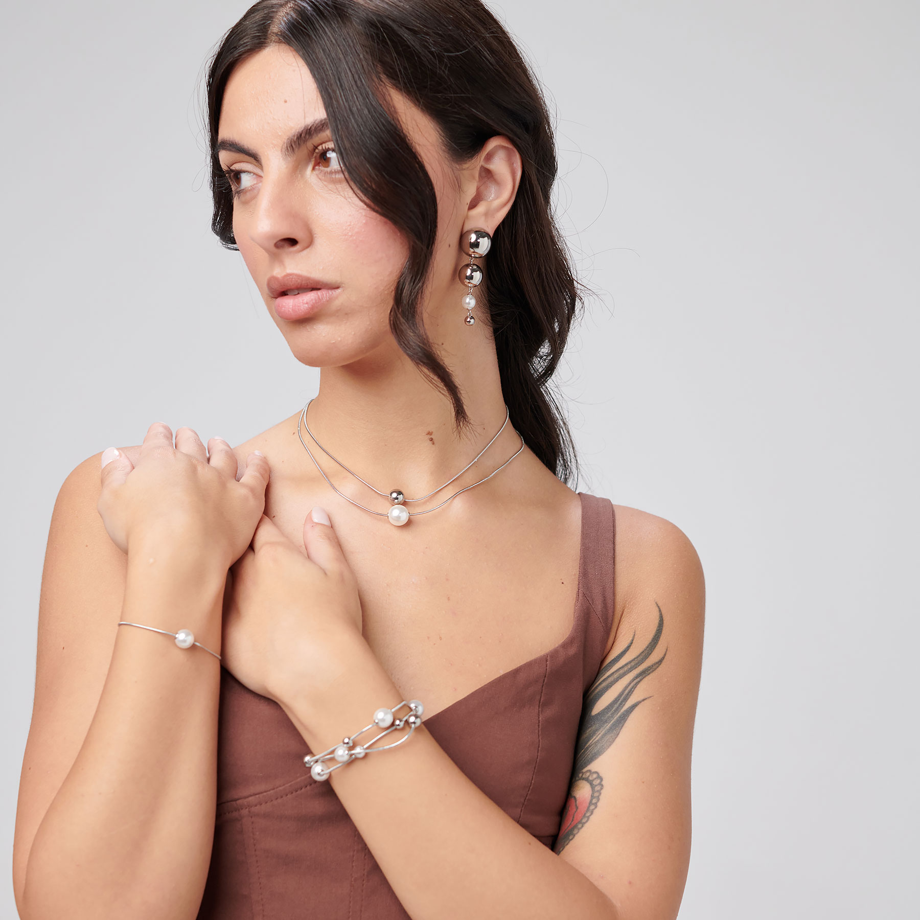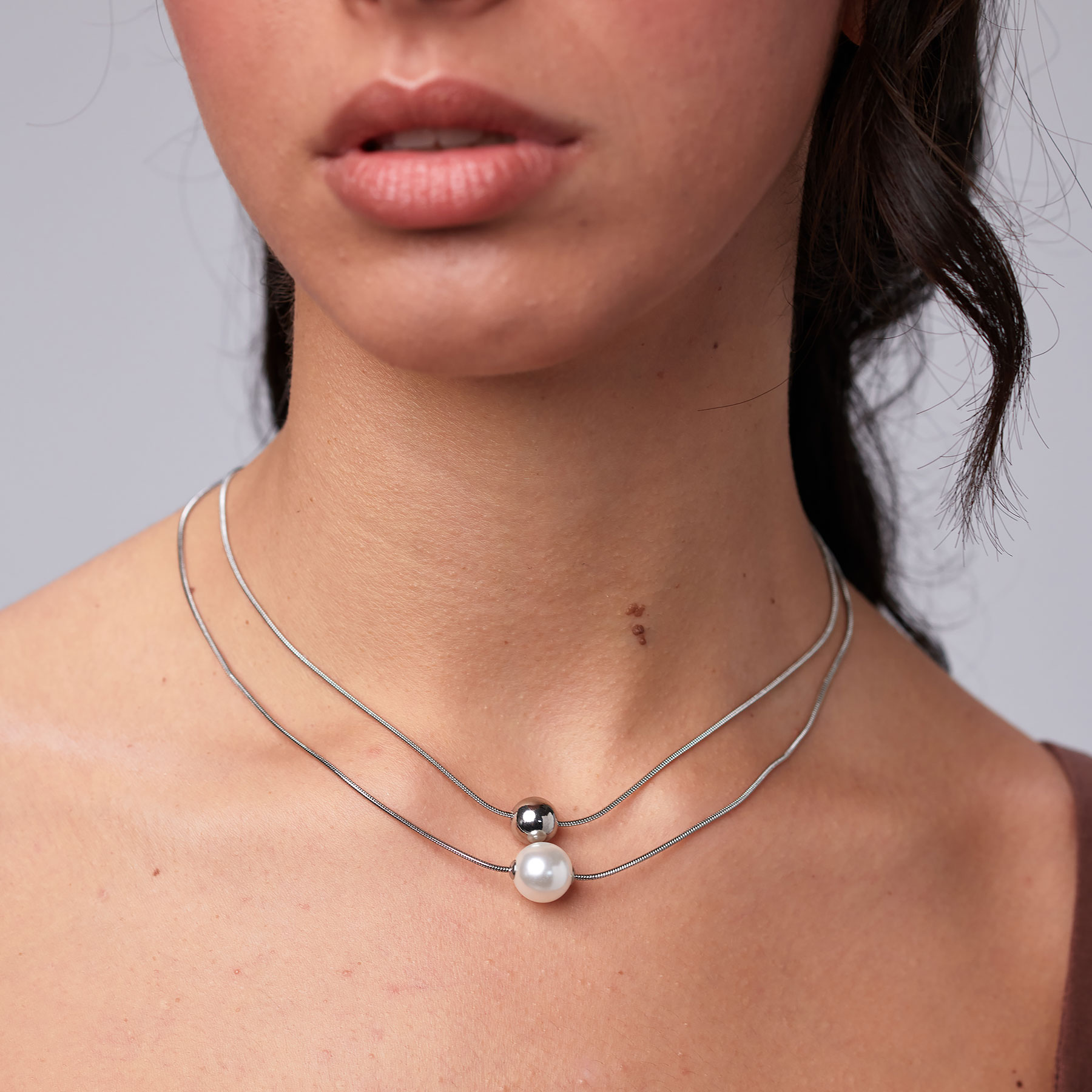 316L stainless steel double-strand choker necklace with a sphere pendant and shell pearl.