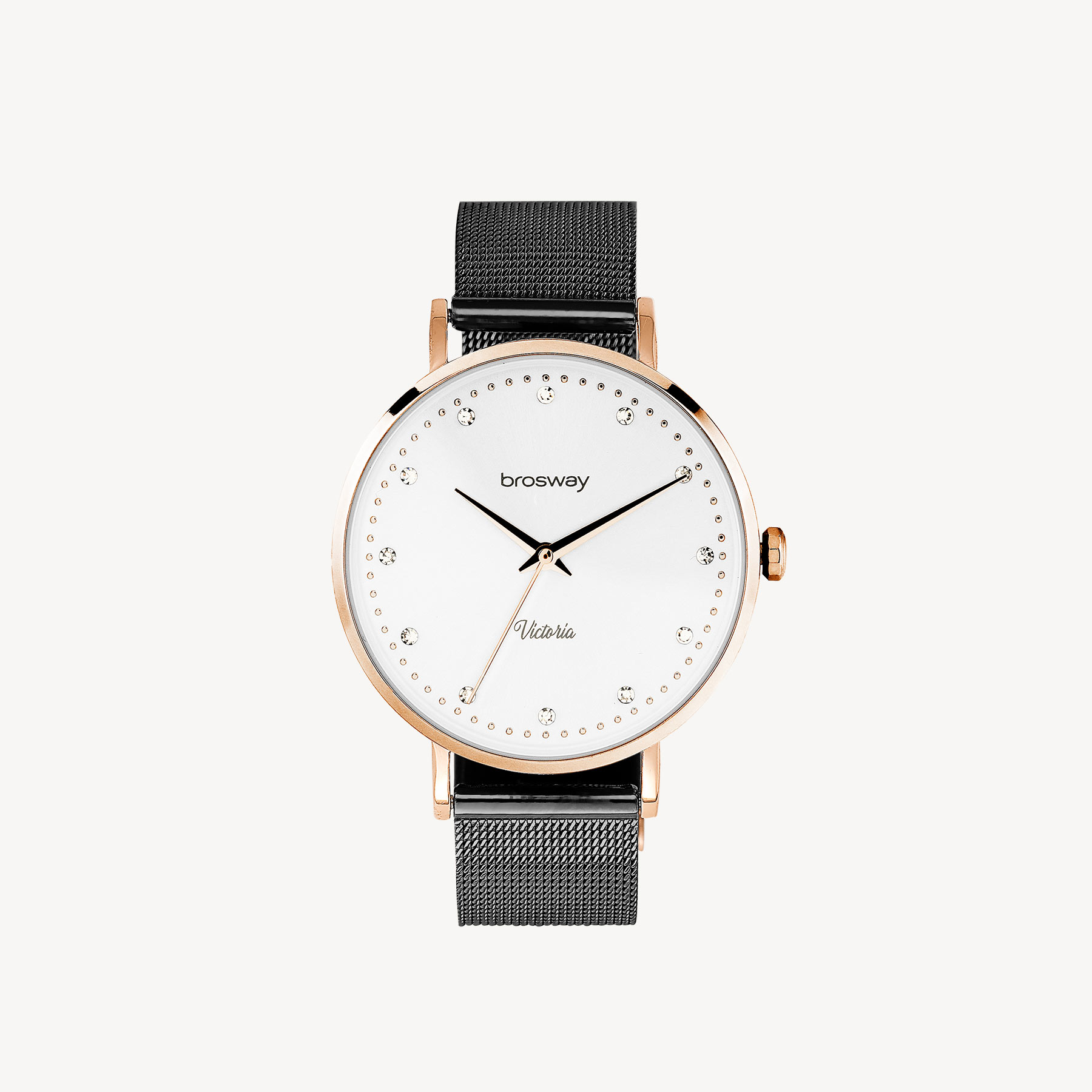 304 stainless steel Time-only watch, 14K rose gold PVD finish with a white copper dial with crystals, black Milanese mesh strap and rose gold color buckle with magnet. Case Ø 34 mm in 304 steel with transparent mineral glass and push crown.