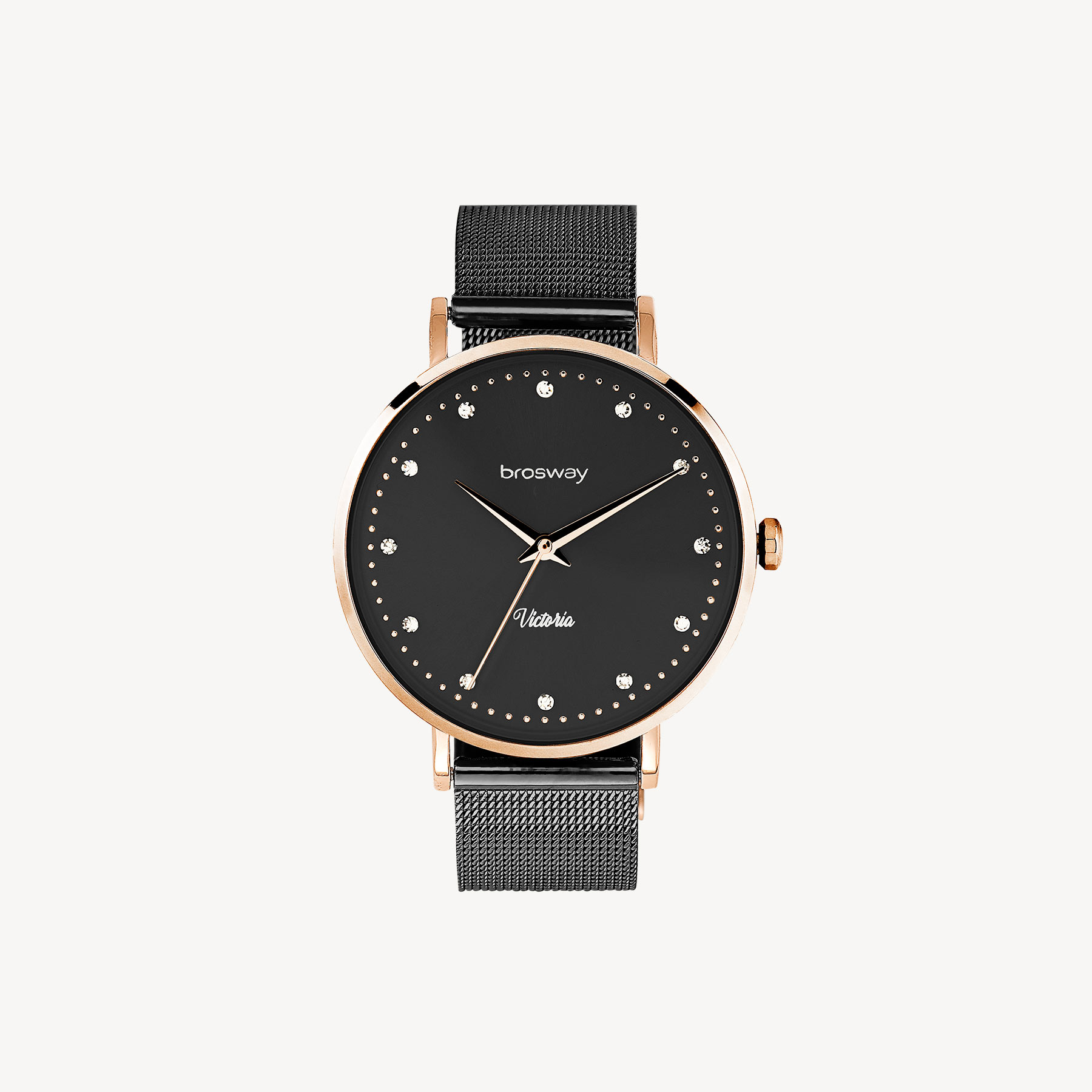 304 stainless steel Time-only watch, 14K rose gold PVD finish with black copper dial with crystals, black Milanese mesh strap and rose gold color buckle with magnet. Case Ø 34 mm in 304 steel with transparent mineral glass and push crown.