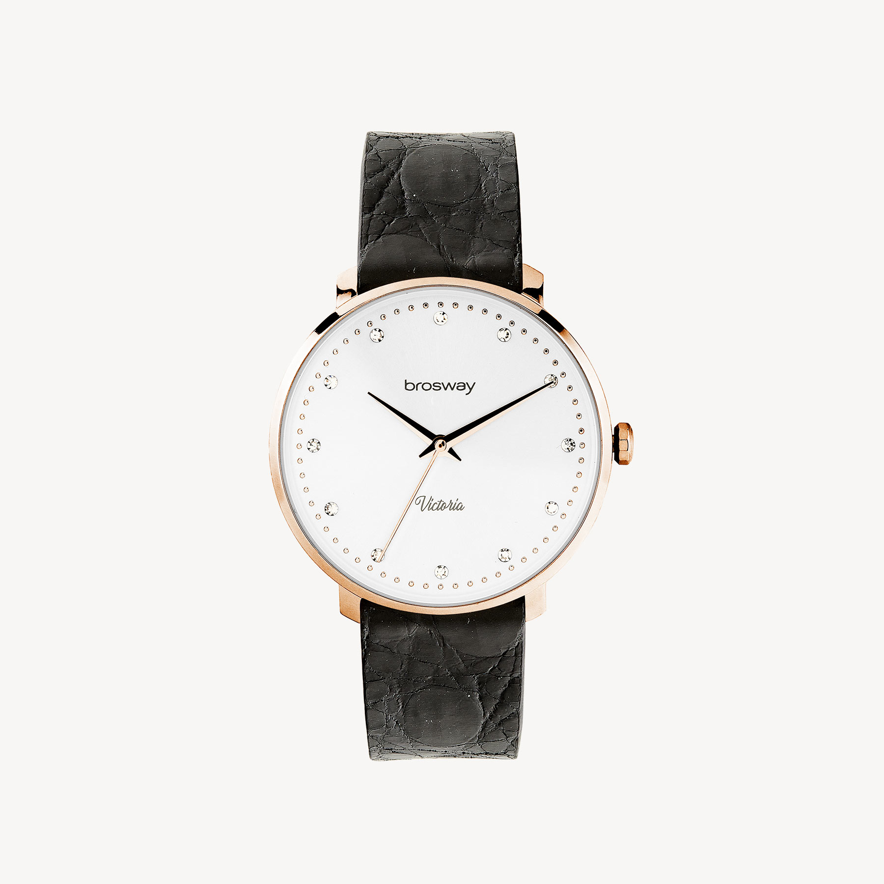 304 stainless steel Time-only watch with 14K rose gold PVD finish, white copper dial with crystals, black crocodile leather strap, steel buckle with 14K rose gold PVD finish. Case Ø 34 mm in 304 steel with 14K rose gold PVD finish, transparent mineral glass, and push crown.