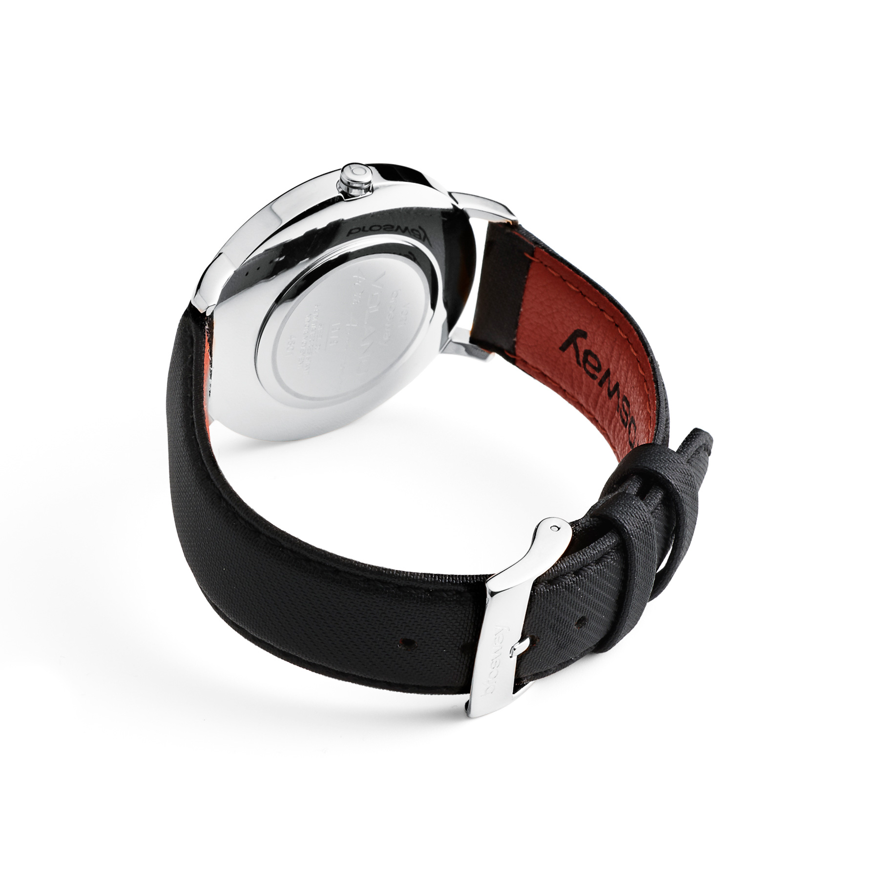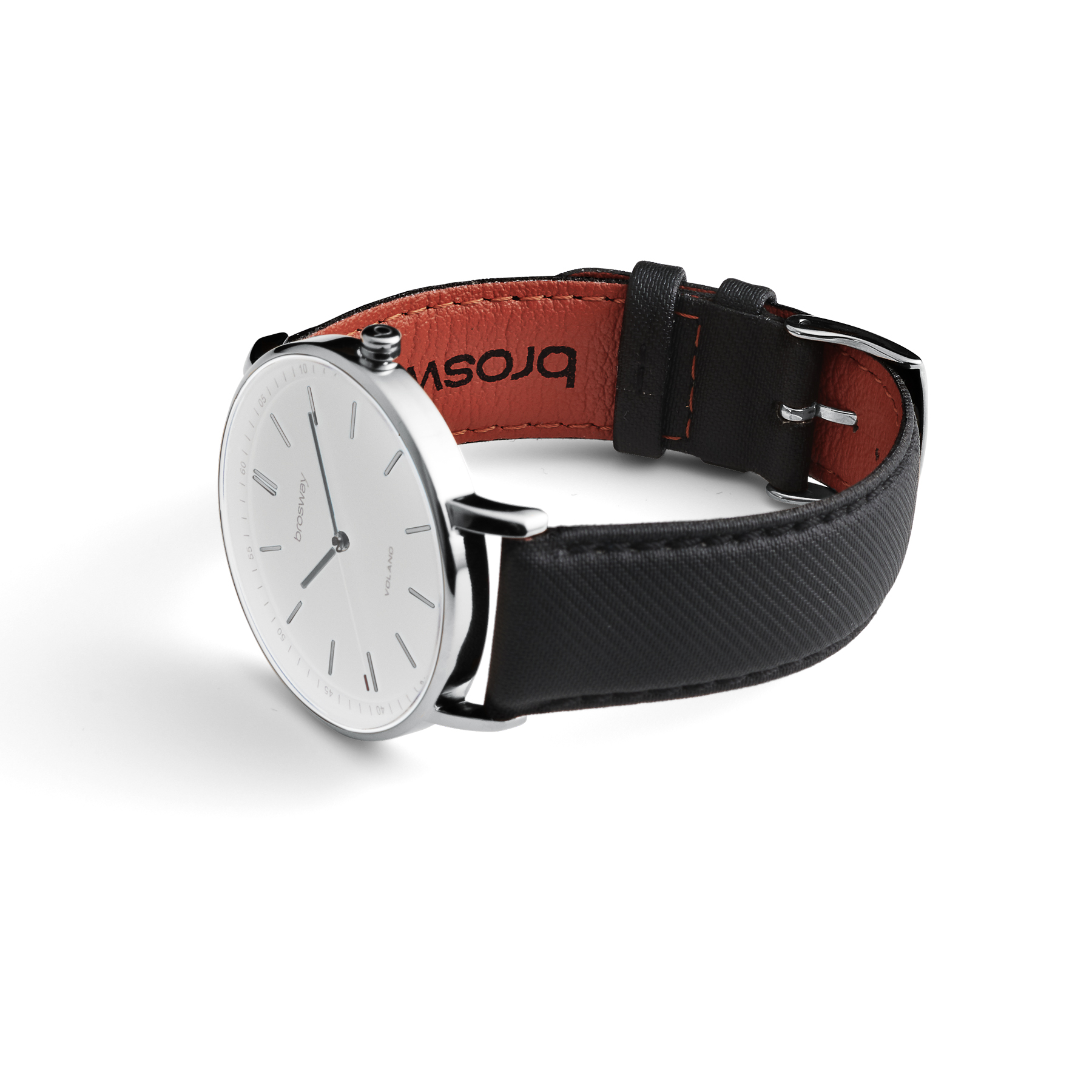 304 stainless steel Time-only watch with a white dial and a black fabric strap with a natural orange leather interior and a steel buckle. Case Ø 40 mm in 304 stainless steel with transparent mineral glass and a screw-down crown.