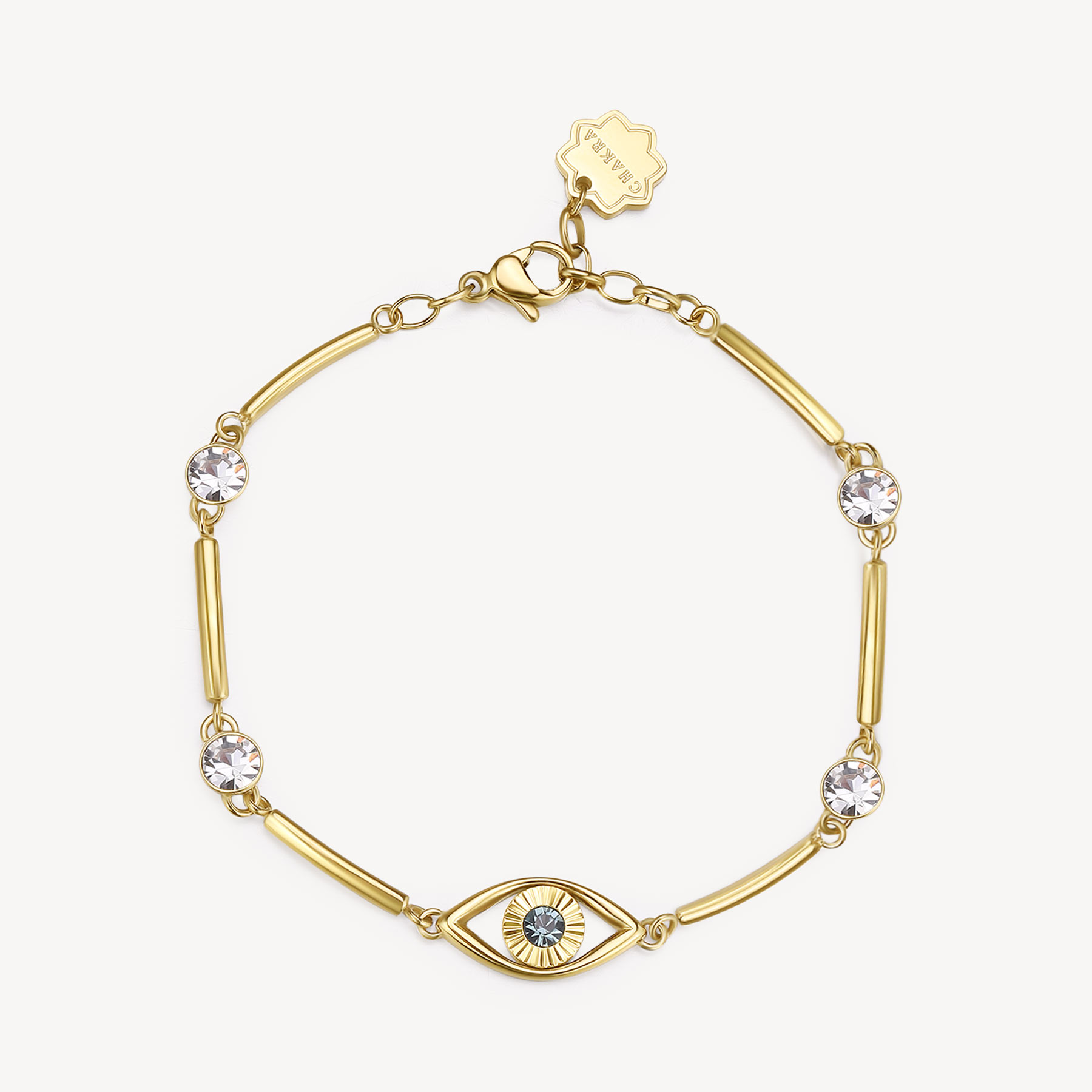 316L stainless steel semi-stiff bracelet and 14k gold pvd coating with evil eye, crystal crystals and smoked sapphire