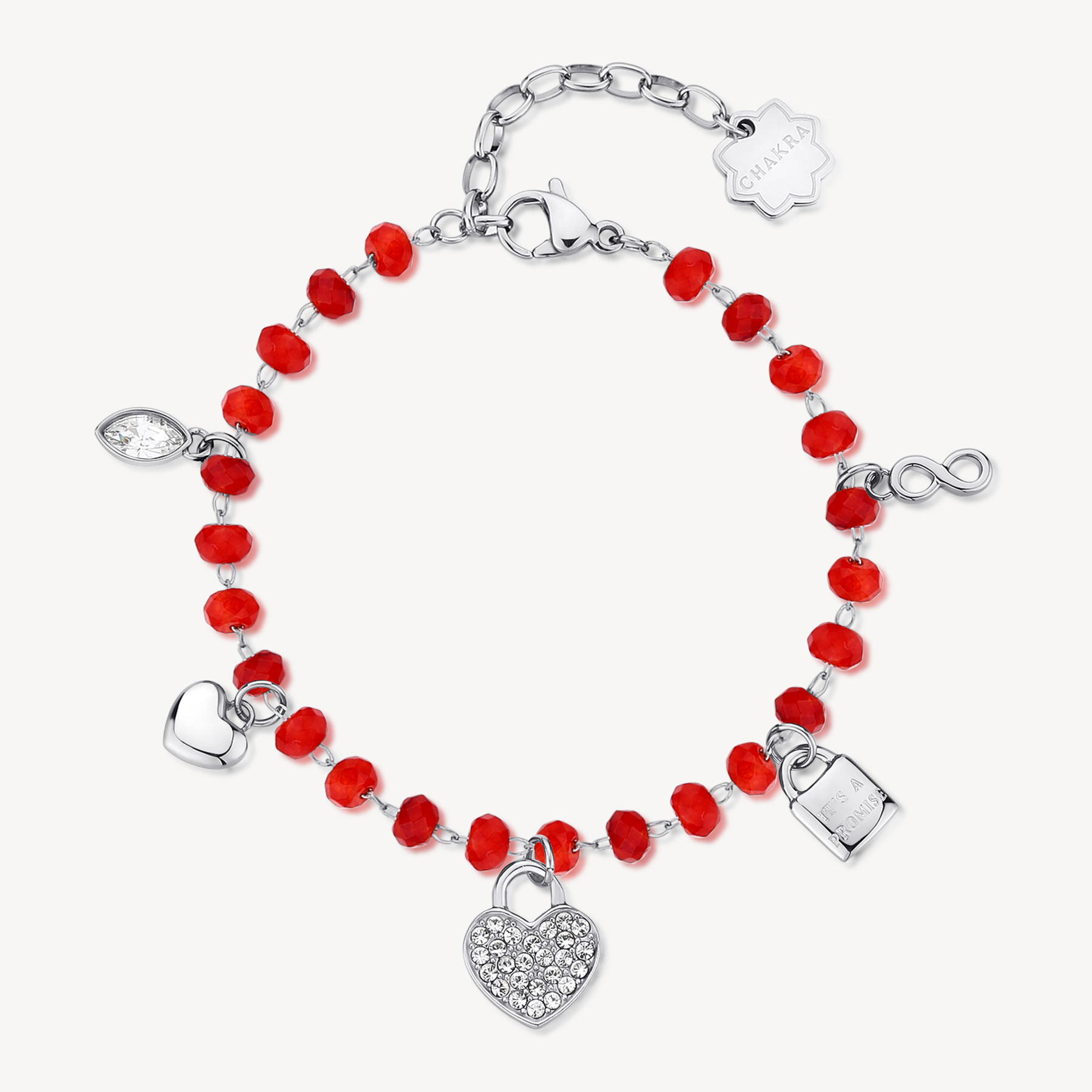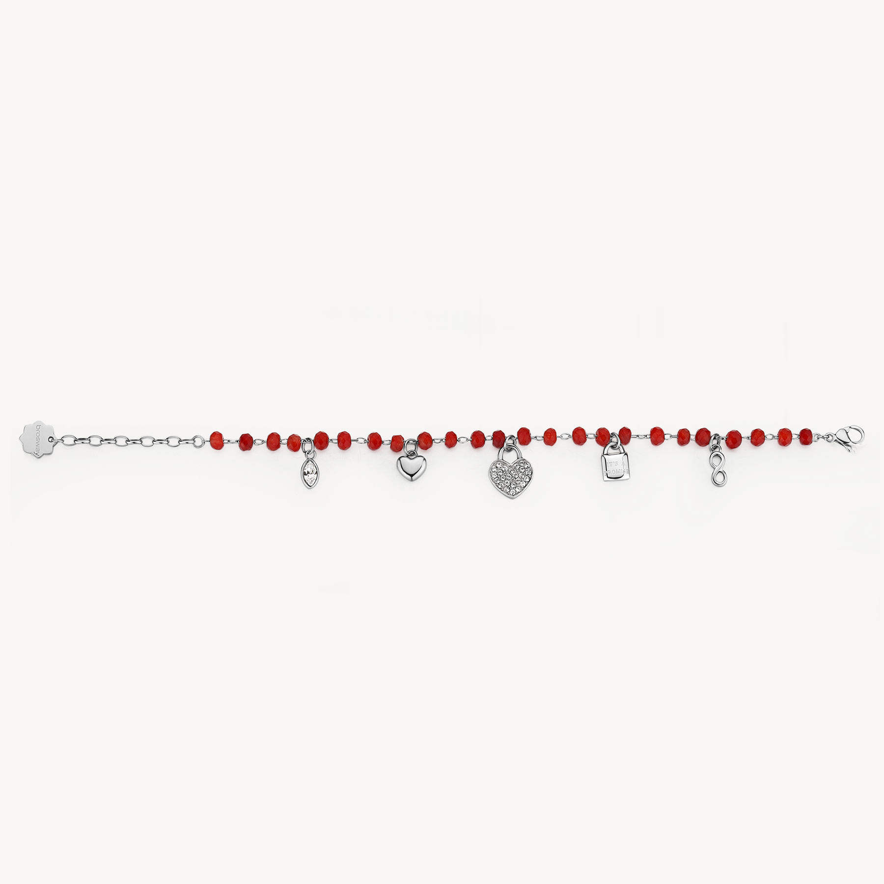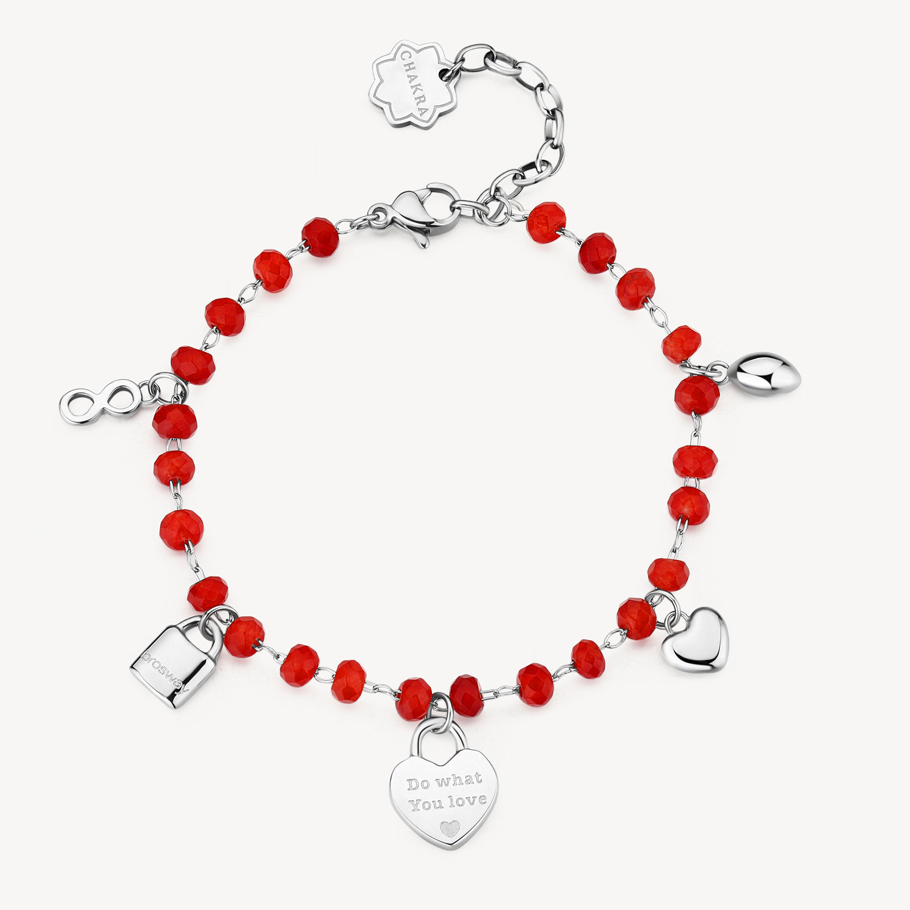 316L stainless steel bracelet, with love, red calcedonio and clear crystals pendants.