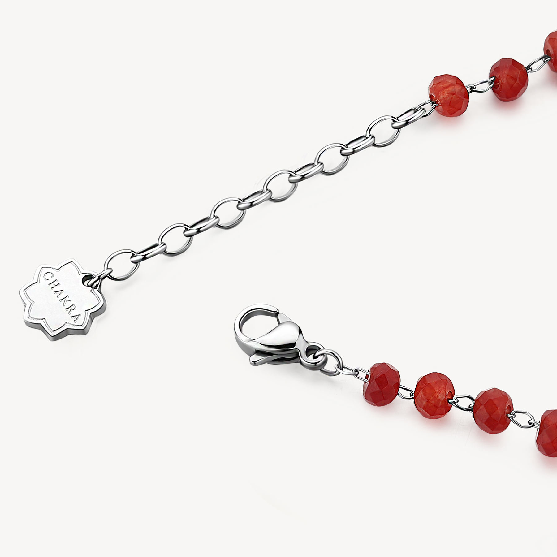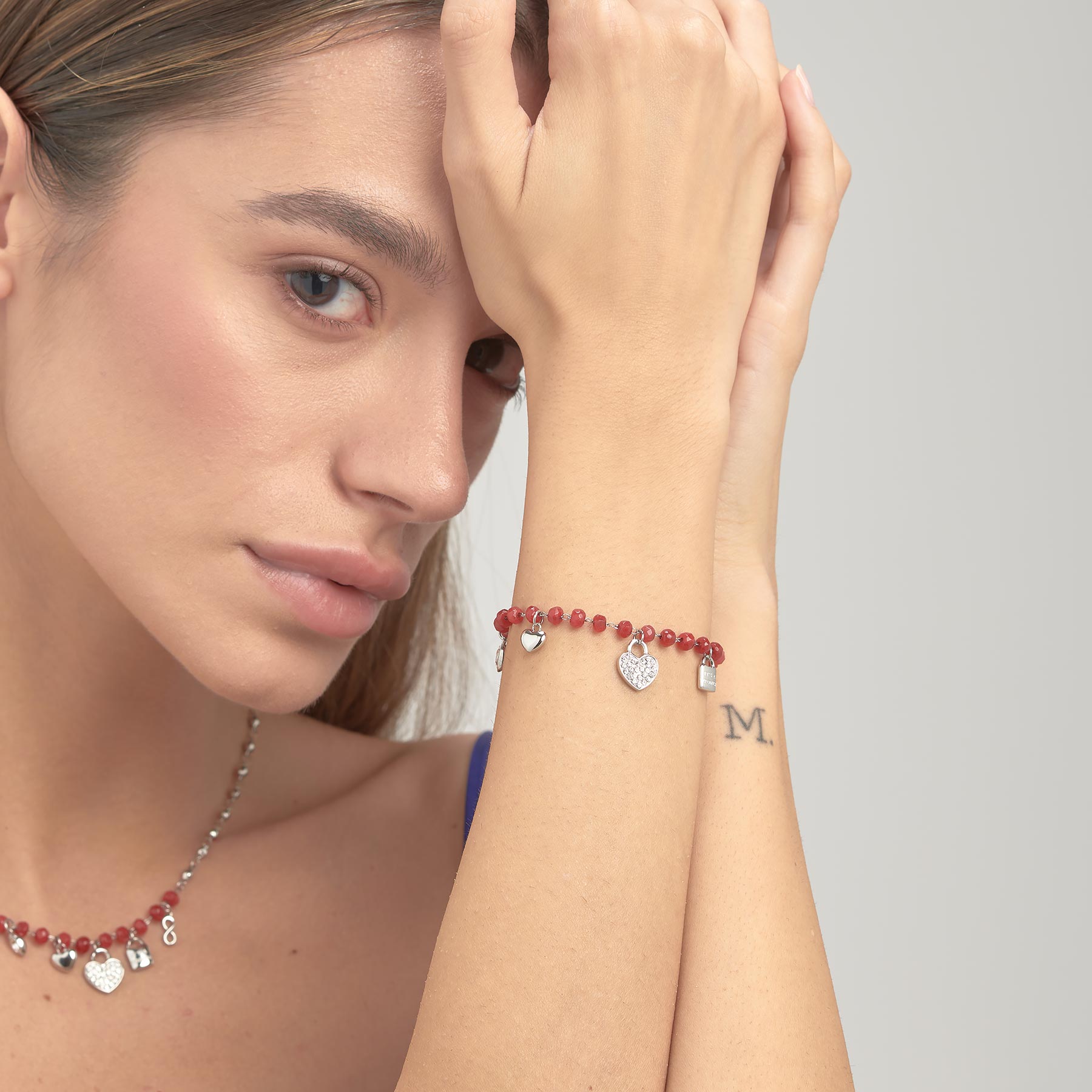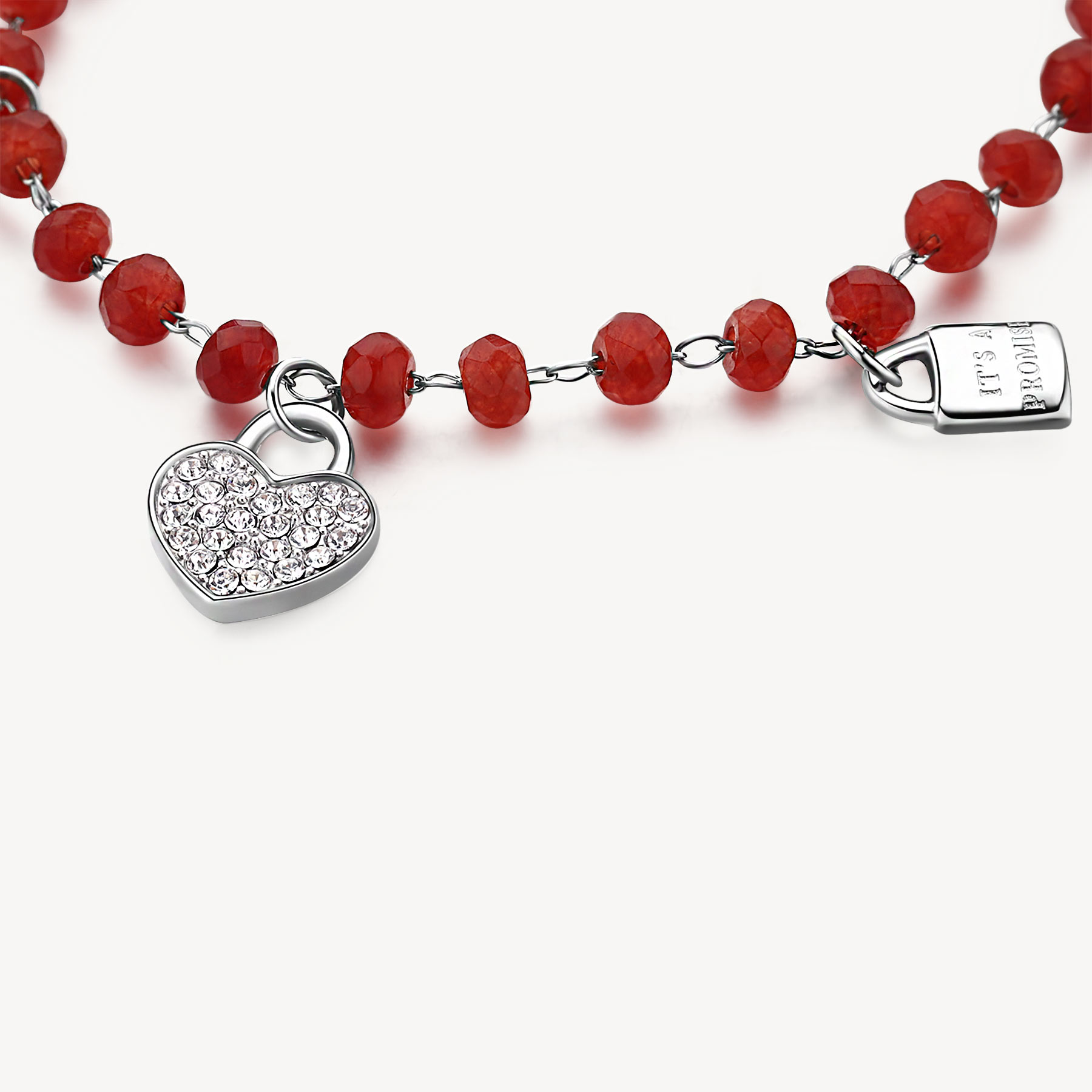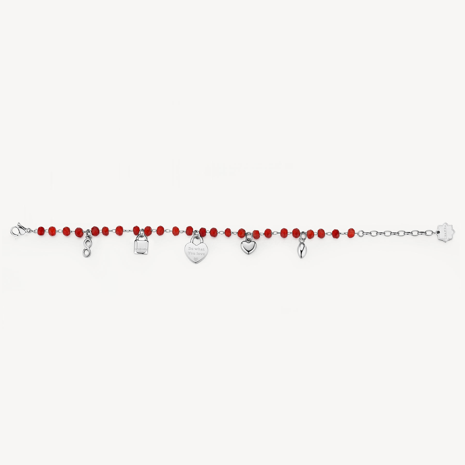 316L stainless steel bracelet, with love, red calcedonio and clear crystals pendants.