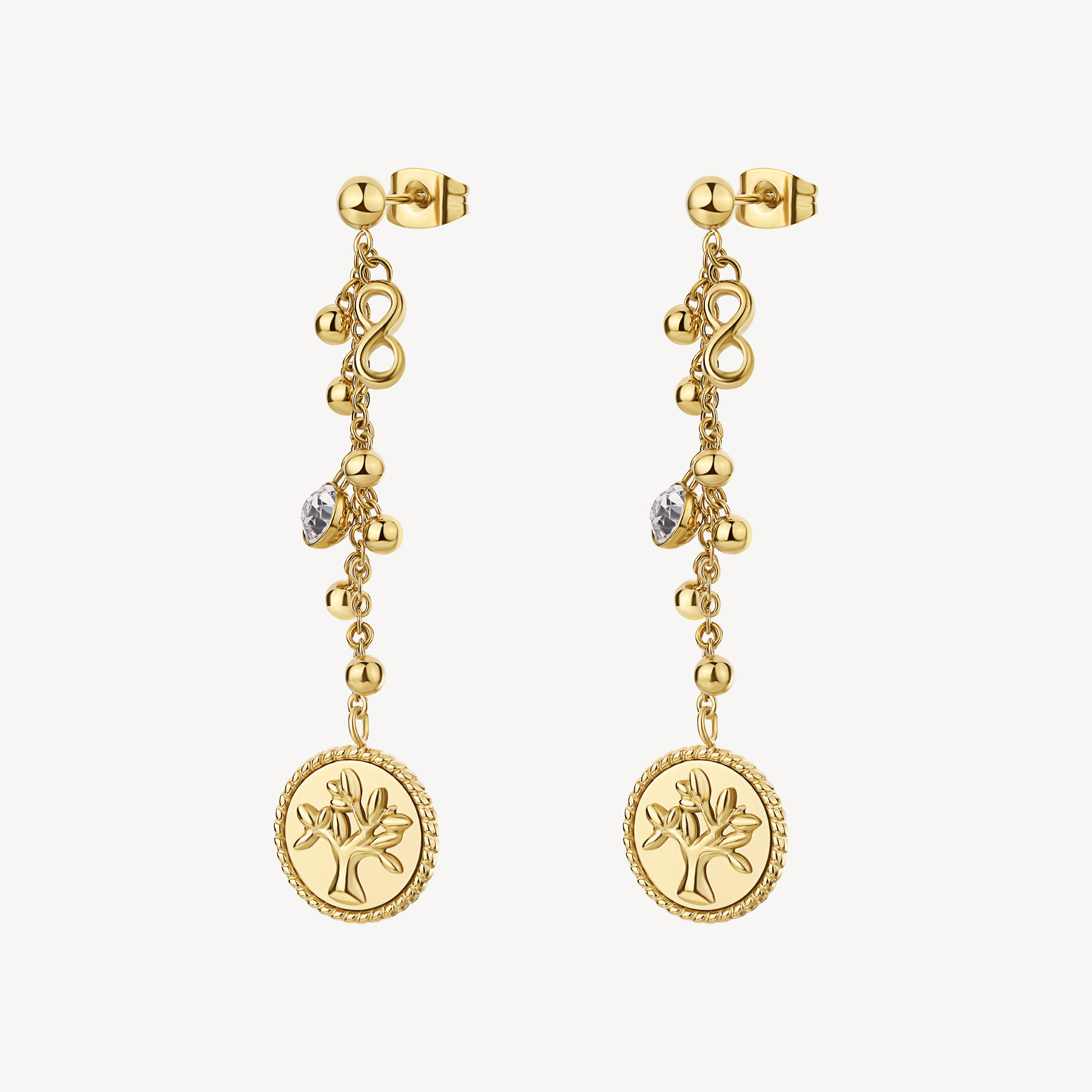 316L stainless steel pendant earrings and 14K gold pvd coating with tree of life and crystals
