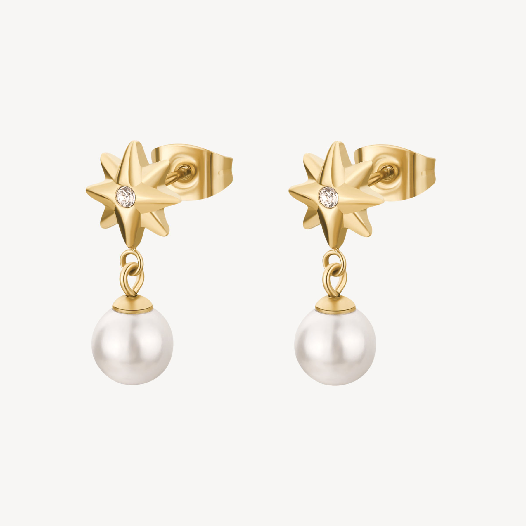 316L steel earrings with 14K gold pvd coating in the shape of a compass rose, with shell beads and crystals.