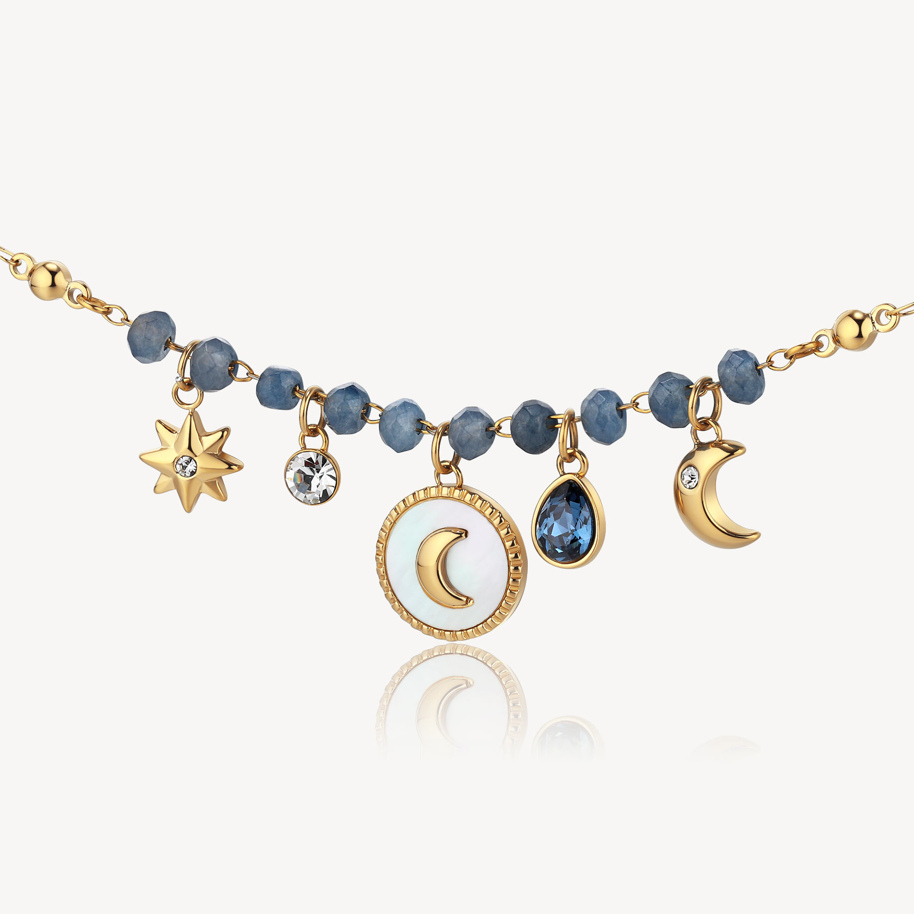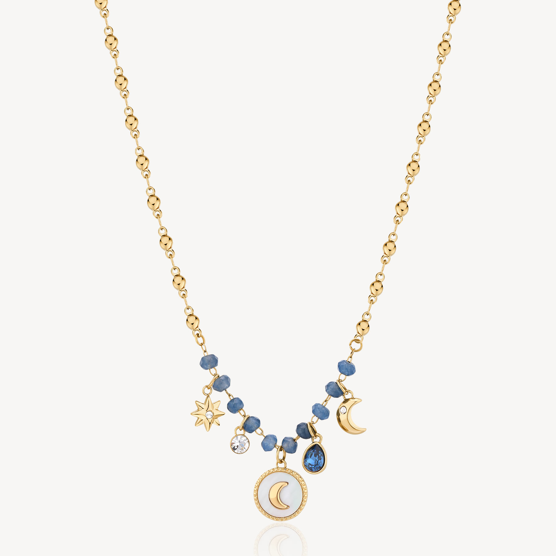 316L stainless steel necklace and 14K gold pvd coating with blue calcedonio and moon, mother-of-pearl, clear and montana color crystals pendants.