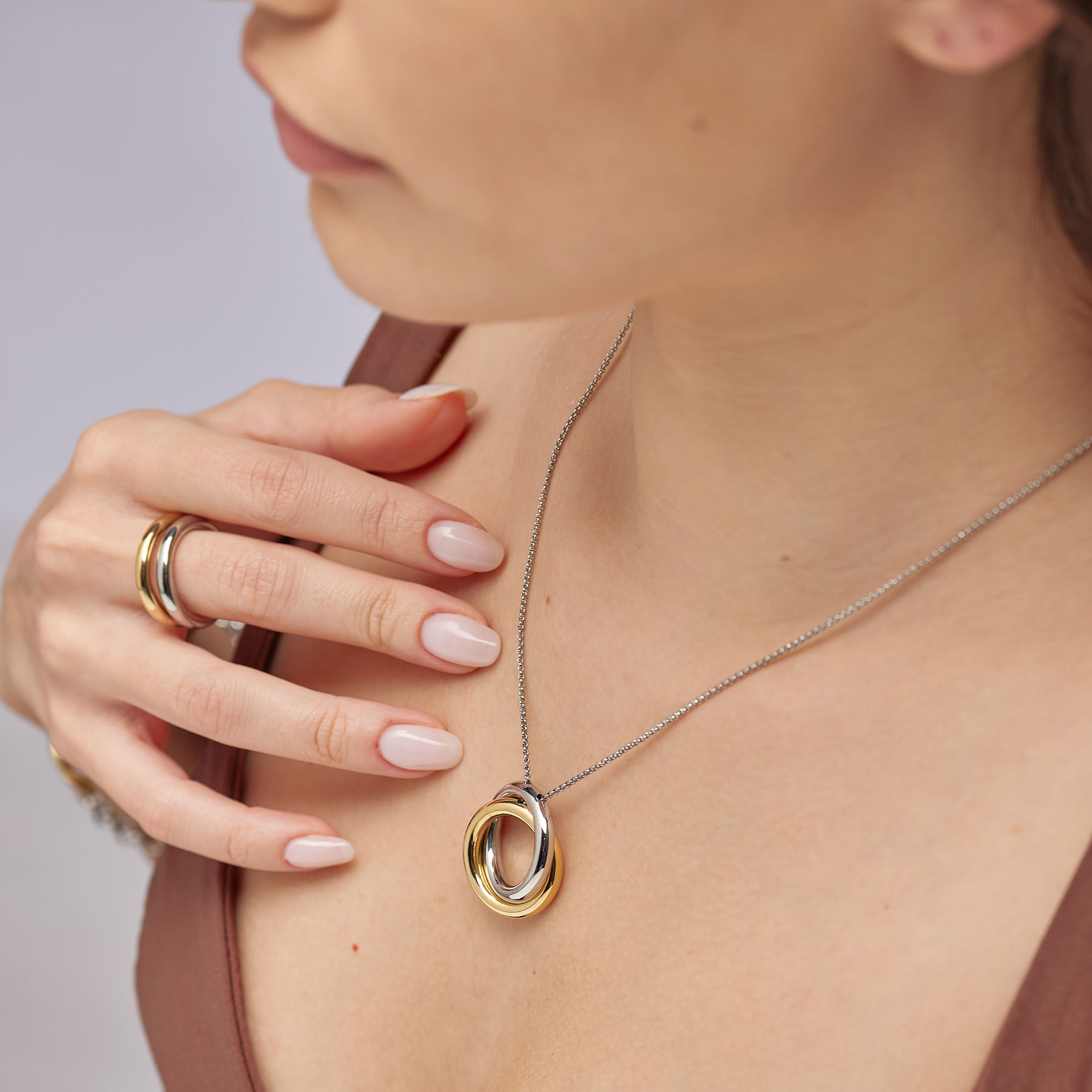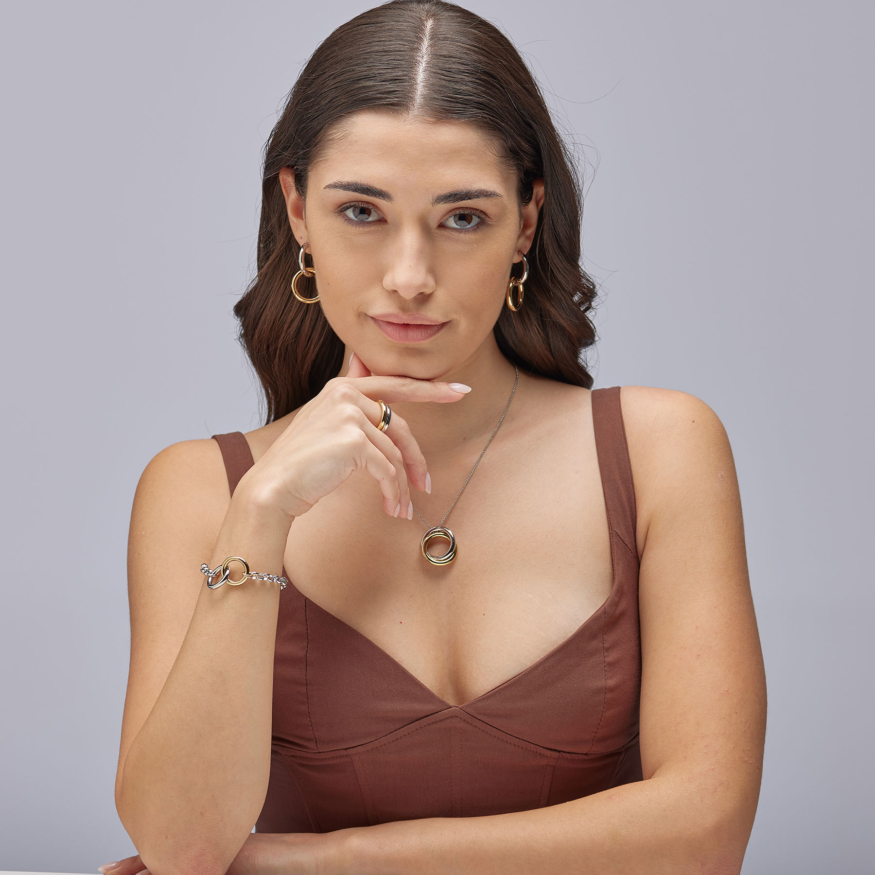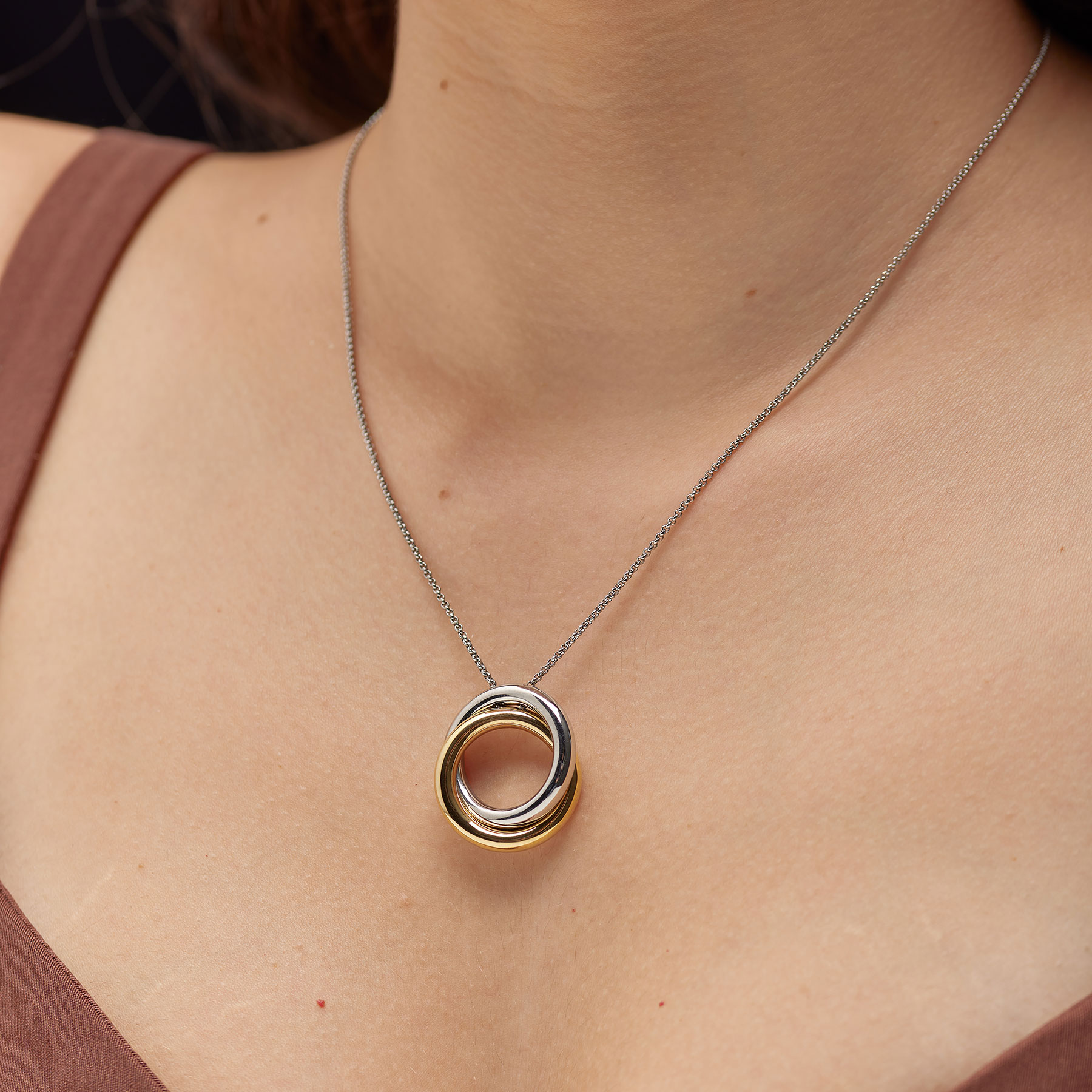 Collar largo en acero 316L, acabado pvd oro 14K con colgante en forma de círculos cruzados.