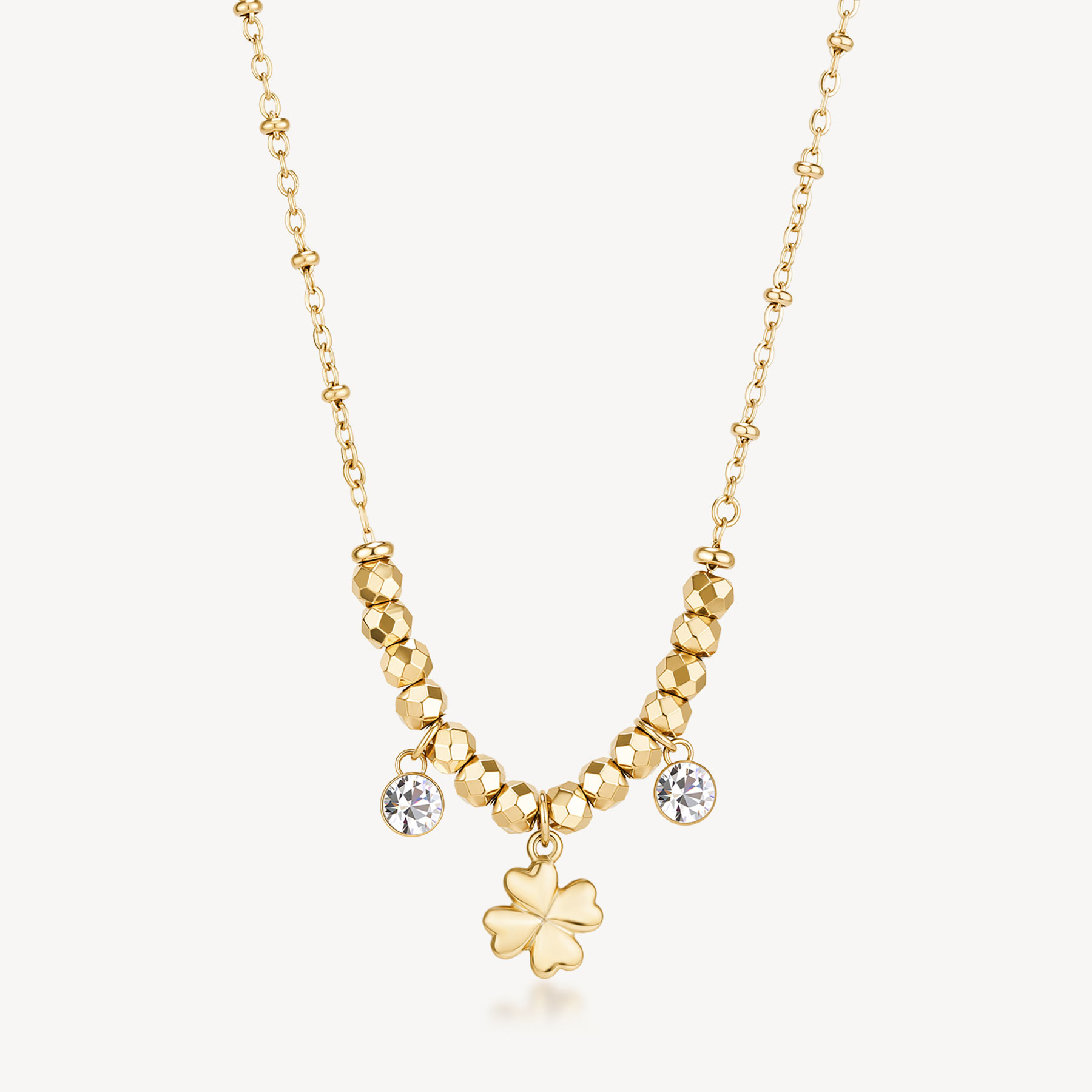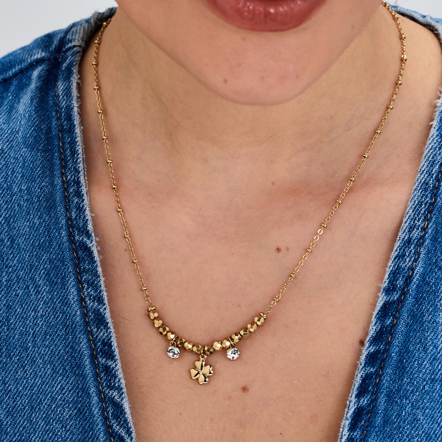 Collar de acero 316L con acabado PVD de oro de 14K, con colgantes de trébol y cristales.