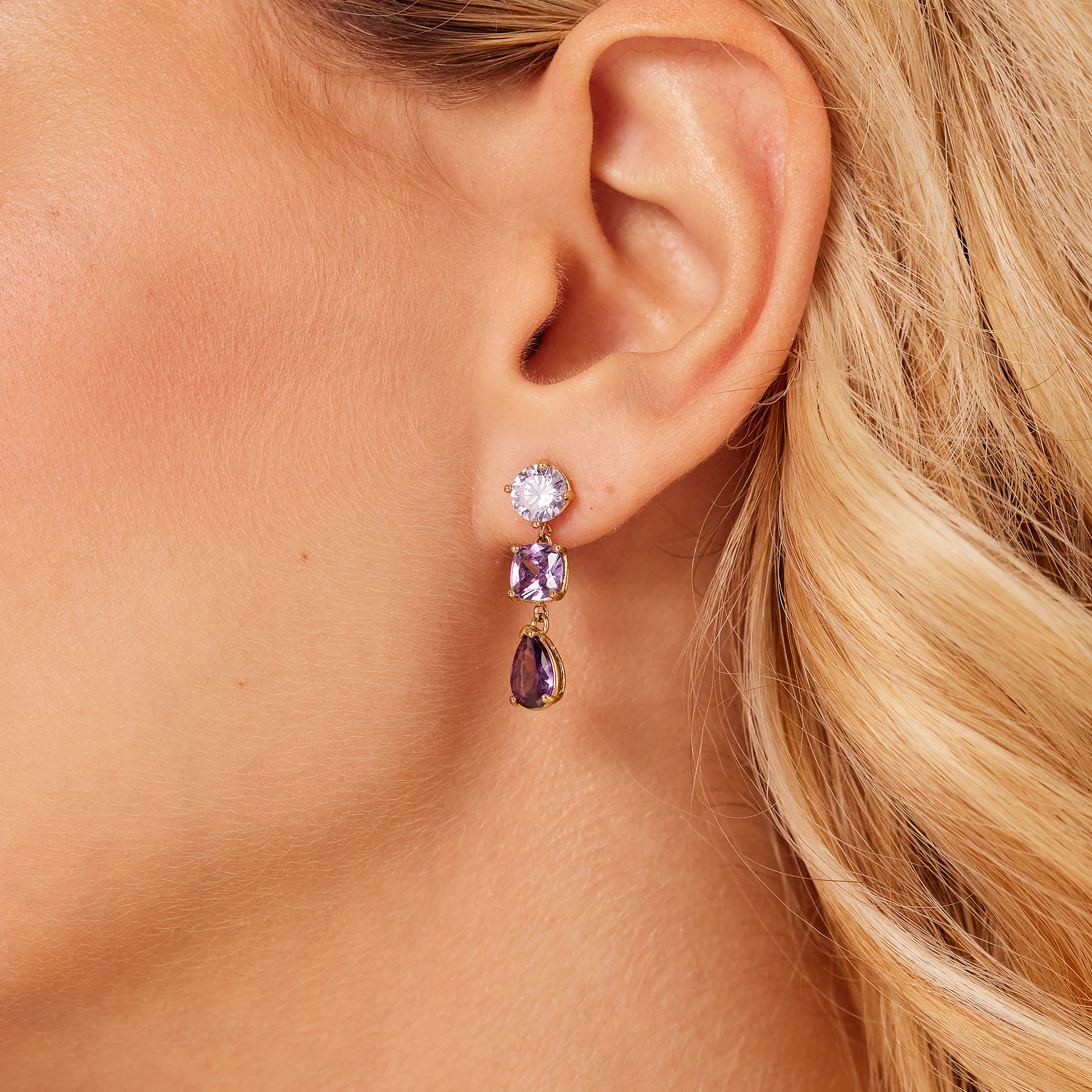 Pendientes colgantes de acero 316L, acabado PVD oro de 14K con circonita cúbica en forma redonda, en forma de cojín y de pera color amatista.