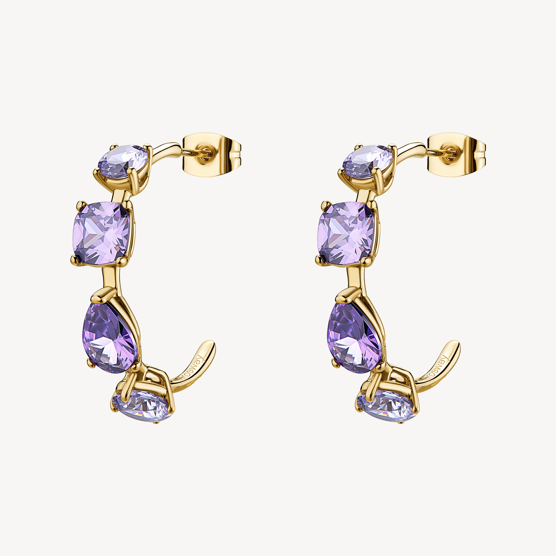 Pendientes de aro de acero 316L, acabado PVD oro de 14K con circonita cúbica en forma redonda, en forma de cojín y de pera color amatista.