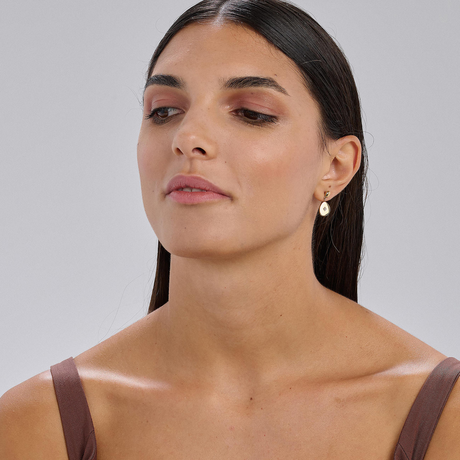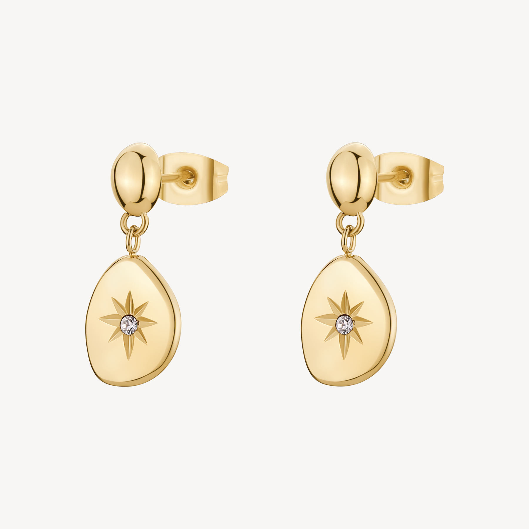 Pendientes colgantes de acero 316L, con acabado pvd de oro 14K y cristales.
