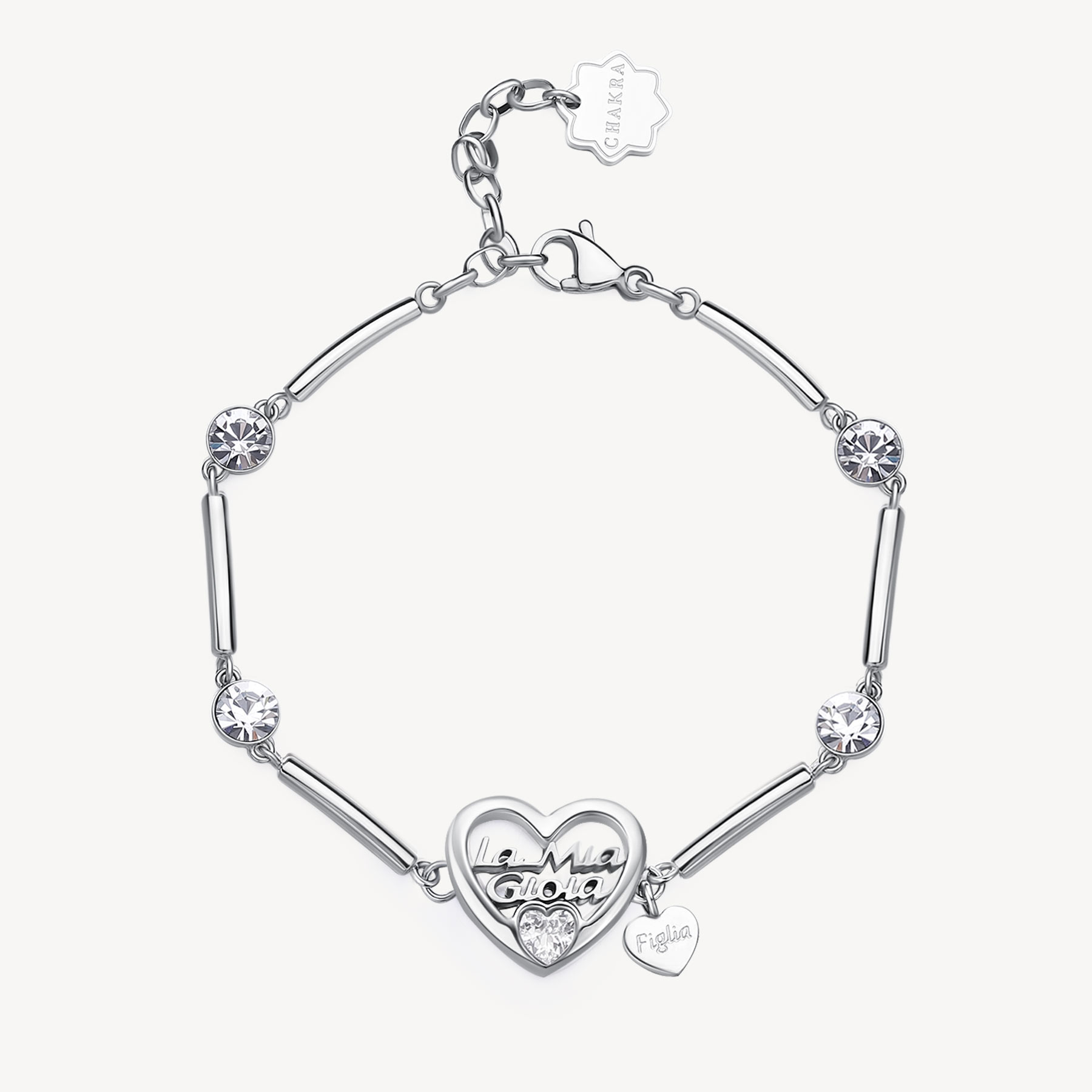 Pulsera semirrígida de acero 316L con central en forma de corazón con escrita "Mi alegría", colgante en forma de corazón con grabado "Figlia" y cristales.