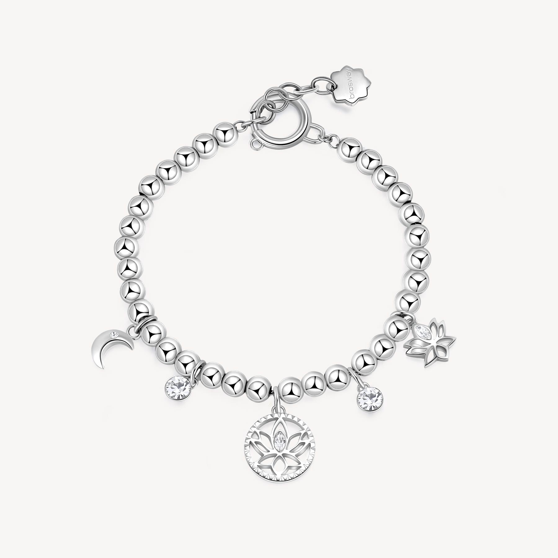 Pulsera de bolas de acero 316L con colgantes en forma de flor de loto, luna y cristales.
