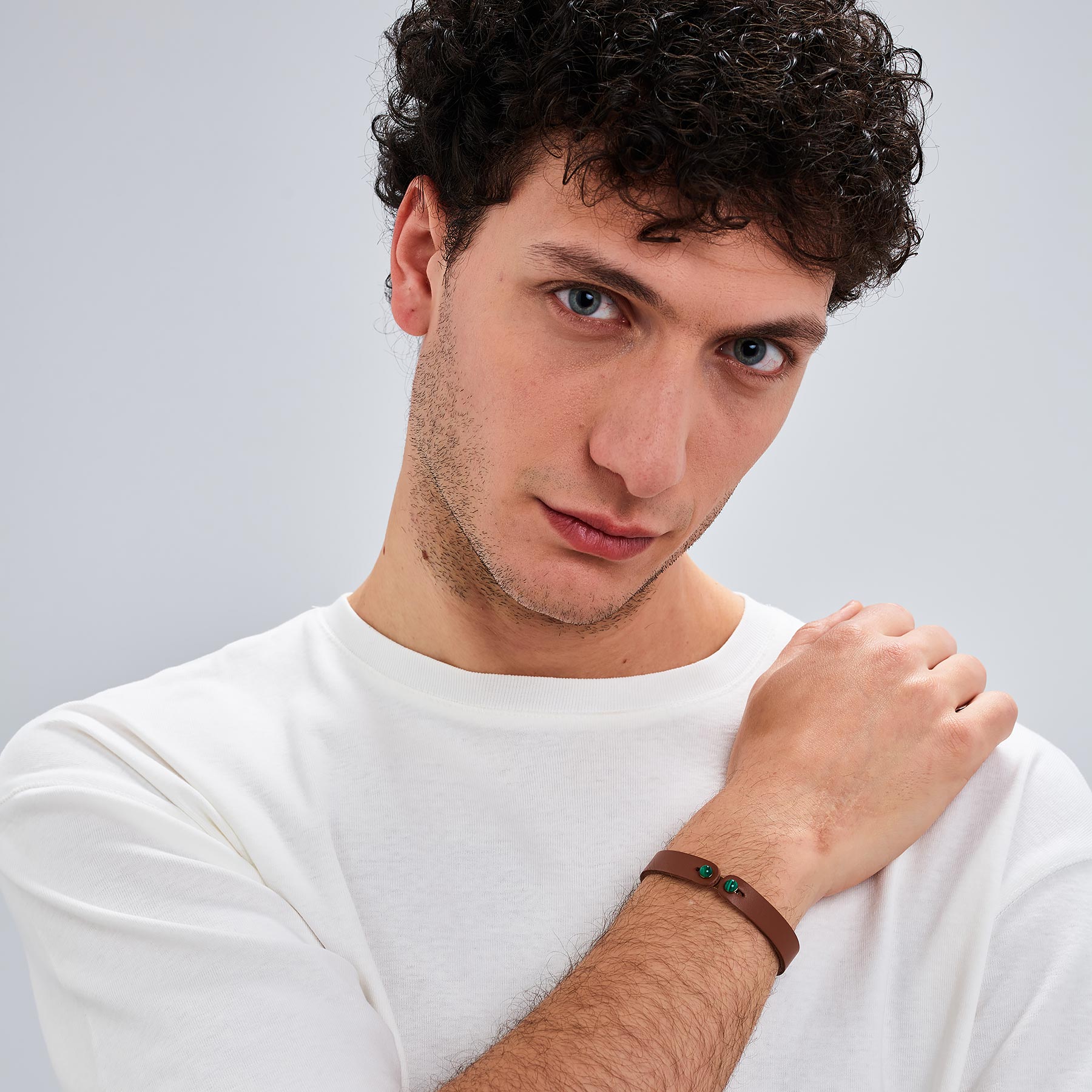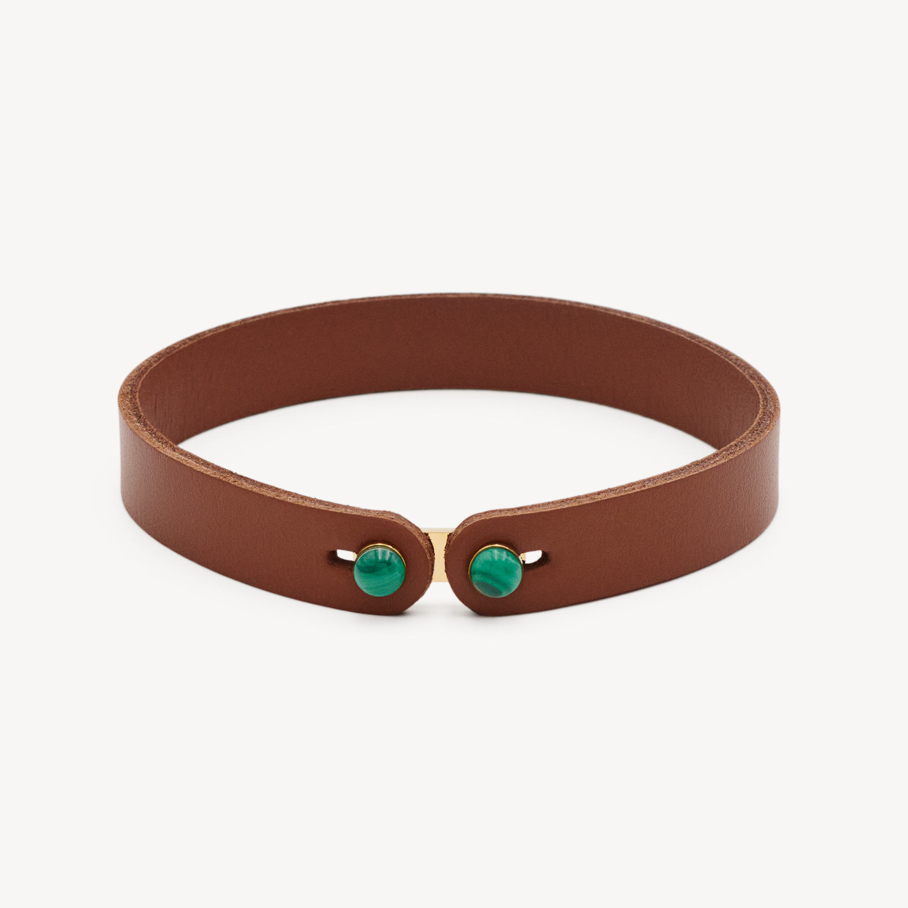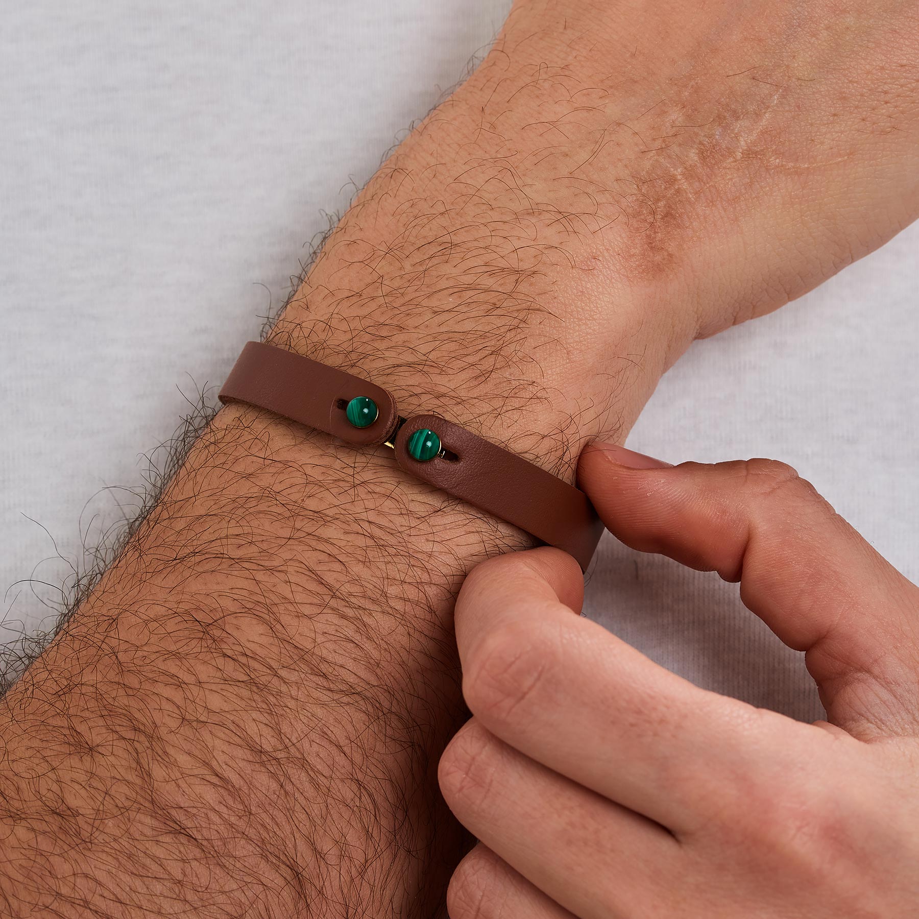 Pulsera de piel color marrón con elemento de cierre a presión en acero 316L, acabado PVD oro 14K y malaquita.