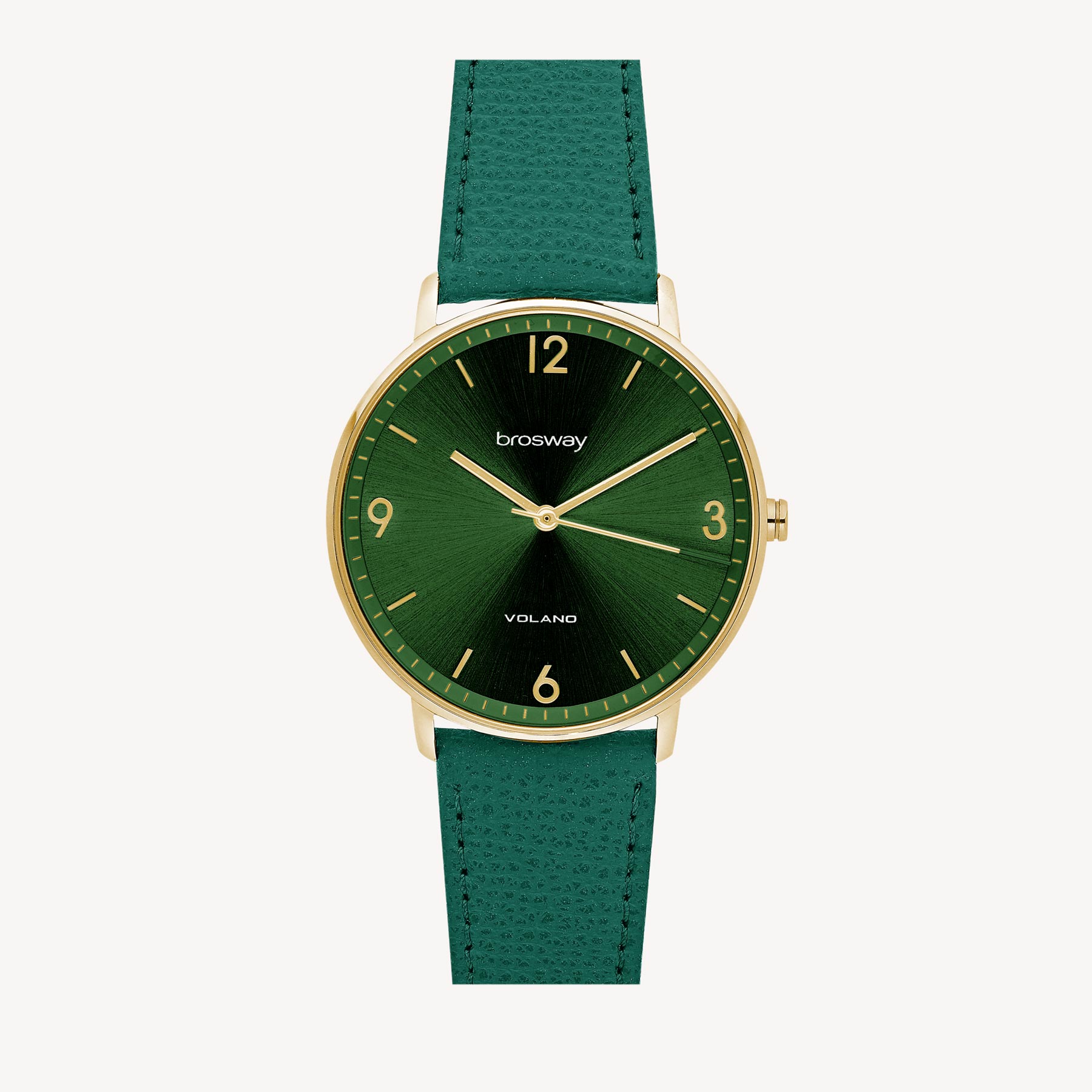 Reloj sólo hora de acero 304 y acabado en pvd oro de 14K con esfera negra efecto rayos de sol, correa de cuero verde, hebilla de acero 304 y acabado en pvd oro de 14K.