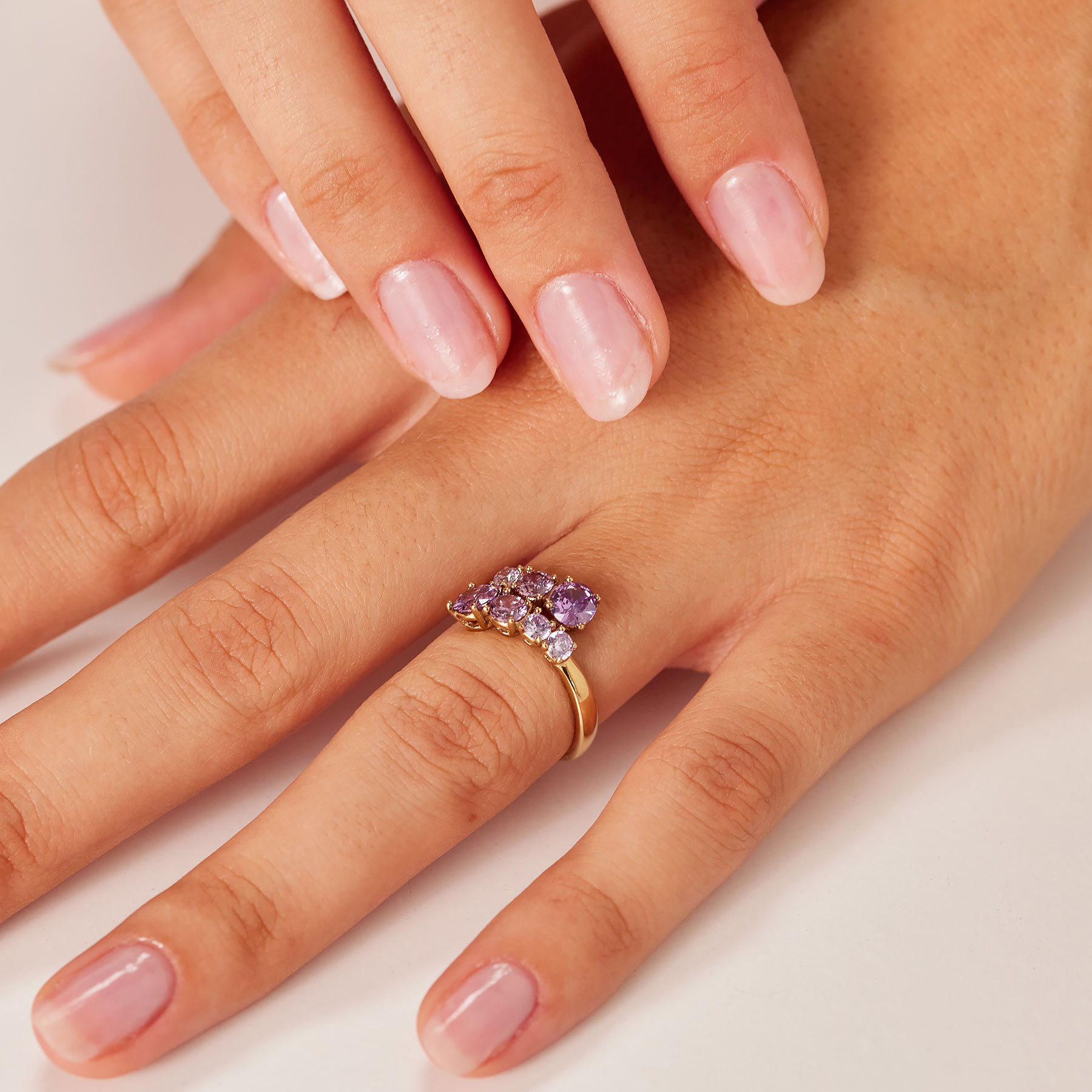 Anello contrarié in acciaio 316L e finitura pvd oro 14K, con cubic zirconia round e cushion colore ametista.