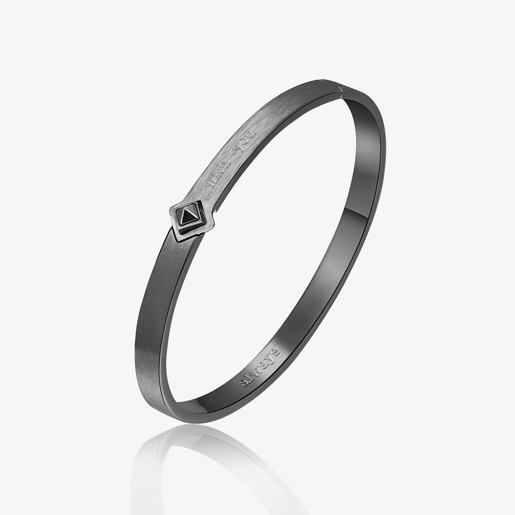 Bracciale rigido in acciaio 316L spazzolato e finitura pvd colore rutenio con incisione.