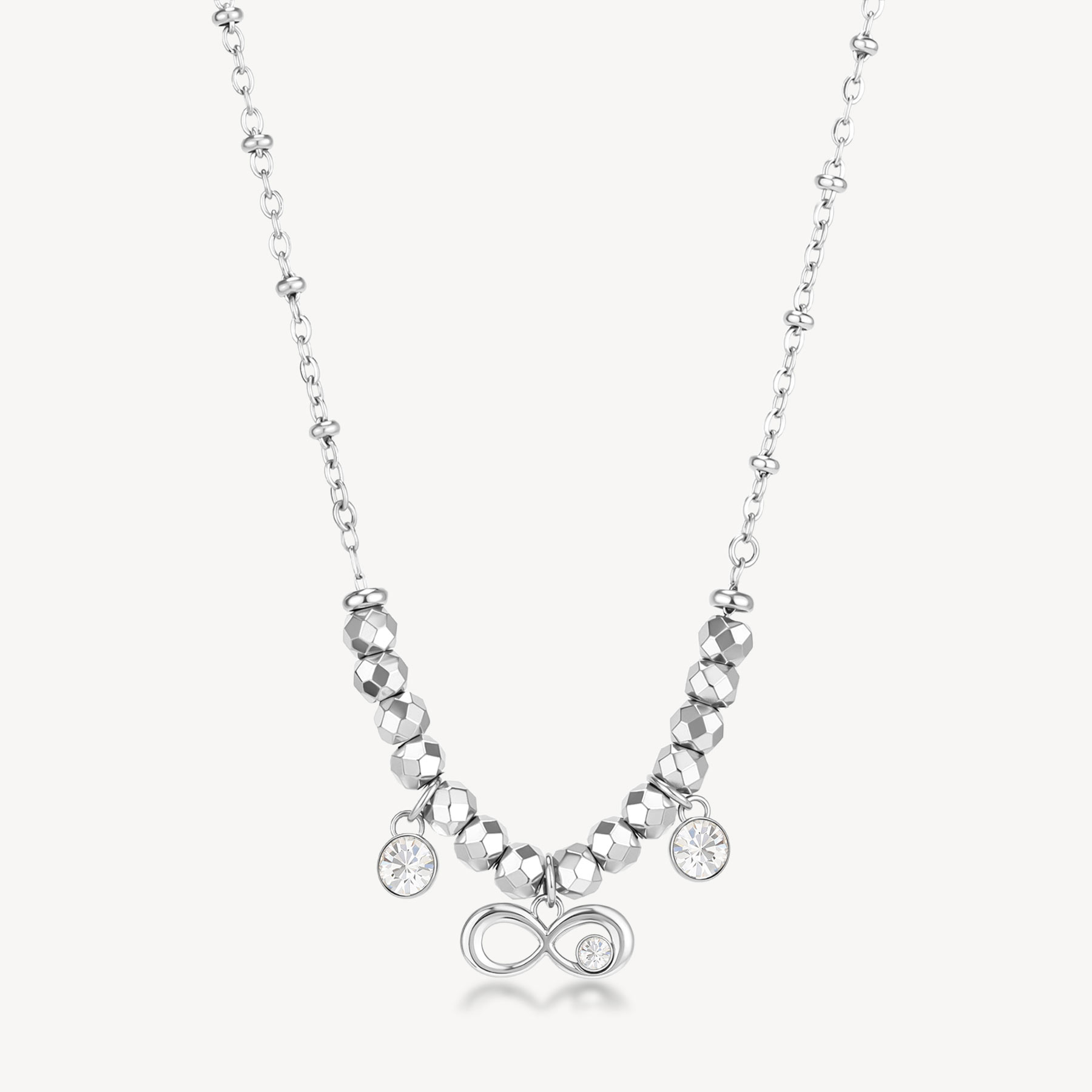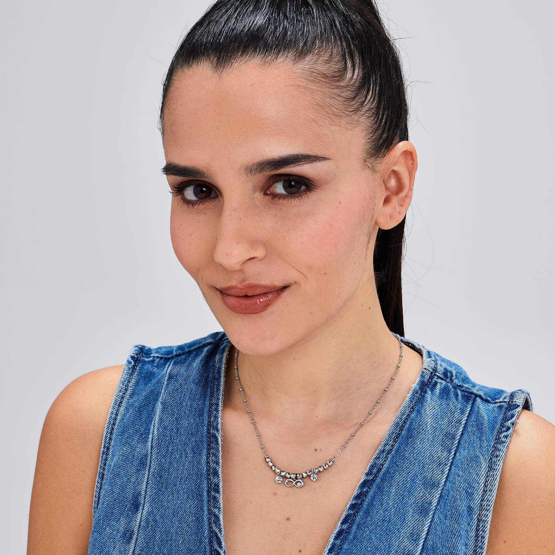 Collana girocollo in acciaio 316L e pendenti con infinito e cristalli.
