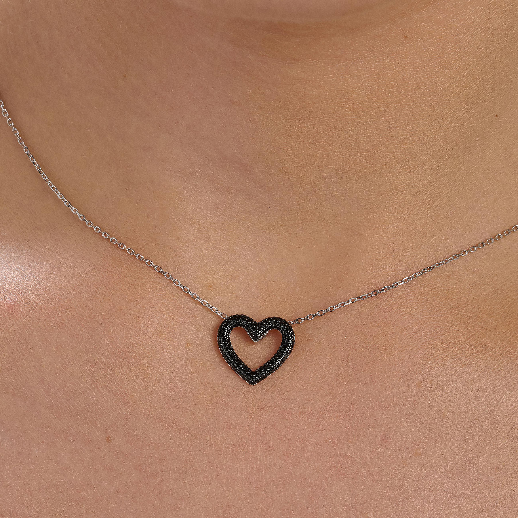 Collana girocollo in argento rodiato 925‰ e galvanica colore rutenio con pendente a forma di cuore e cubic zirconia neri.