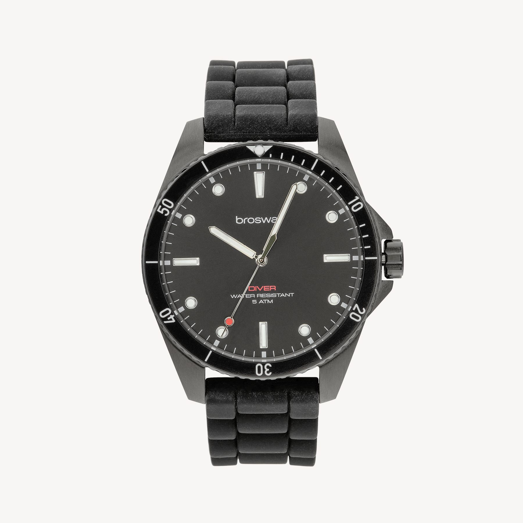 Orologio solo tempo in acciaio 304 e finitura pvd colore nero con quadrante copper nero e cinturino in silicone nero e fibbia in acciaio. Cassa Ø 42 mm in acciaio 304 e finitura pvd colore nero, con ghiera girevole, vetro minerale trasparente e corona a pressione con doppia guarnizione.